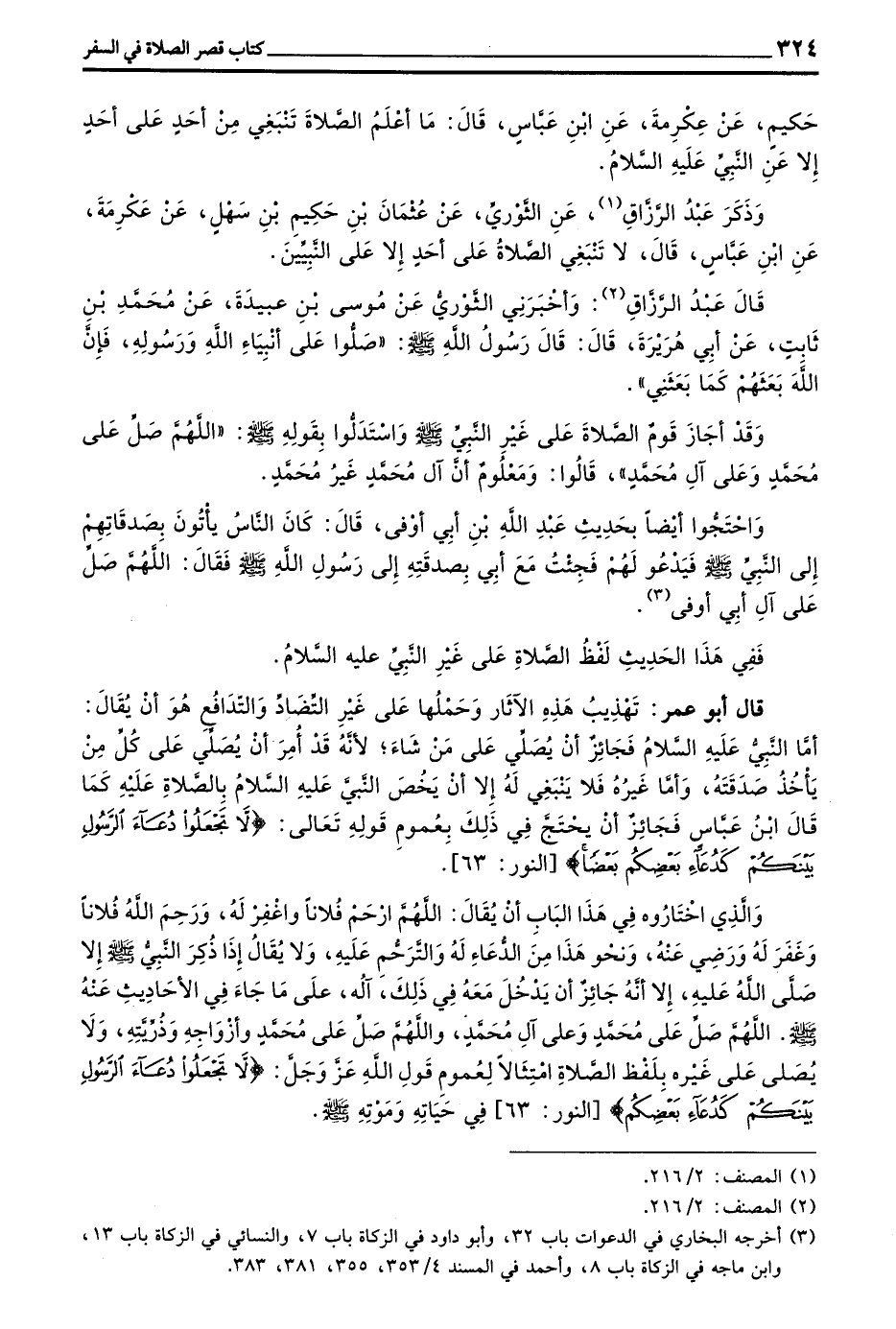 قَالَ أَبُو عُمَرَ تَهْذِيبُ هَذِهِ الْآثَارِ وَحَمْلُهَا عَلَى غَيْرِ التَّضَادِّ وَالتَّدَافُعِ هُوَ أَنْ يُقَالَ أَمَّا النَّبِيُّ عَلَيْهِ السَّلَامُ فَجَائِزٌ أَنْ يُصَلِّيَ عَلَى مَنْ شَاءَ لِأَنَّهُ قَدْ أُمِرَ أَنْ يُصَلِّيَ عَلَى كُلِّ مَنْ يَأْخُذُ صَدَقَتَهُ وَأَمَّا غَيْرُهُ فَلَا يَنْبَغِي لَهُ إِلَّا أَنْ يَخُصَّ النَّبِيَّ عَلَيْهِ السلام بالصلاة عليه كما قال بن عَبَّاسٍ فَجَائِزٌ أَنْ يَحْتَجَّ فِي ذَلِكَ بِعُمُومِ قَوْلِهِ تَعَالَى (لَا تَجْعَلُوا دُعَاءَ الرَّسُولِ بَيْنَكُمْ كَدُعَاءِ بَعْضِكُمْ بَعْضًا) النُّورِ 63