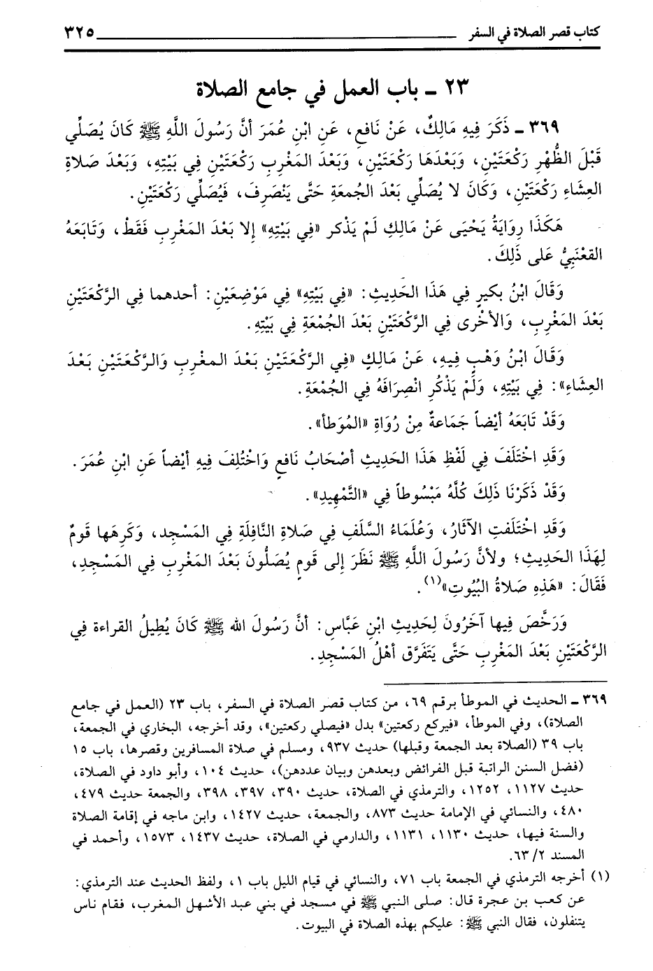 369 - ذَكَرَ فِيهِ مالك عن نافع عن بْنِ عُمَرَ أَنَّ رَسُولَ اللَّهِ صَلَّى اللَّهُ عَلَيْهِ وَسَلَّمَ كَانَ يُصَلِّي قَبْلَ الظُّهْرِ رَكْعَتَيْنِ وَبُعْدَهَا رَكْعَتَيْنِ وَبَعْدَ الْمَغْرِبِ رَكْعَتَيْنِ فِي بَيْتِهِ وَبَعْدَ صَلَاةِ الْعِشَاءِ رَكْعَتَيْنِ وَكَانَ لَا يُصَلِّي بَعْدَ الْجُمُعَةِ حَتَّى يَنْصَرِفَ فَيُصَلِّي رَكْعَتَيْنِ