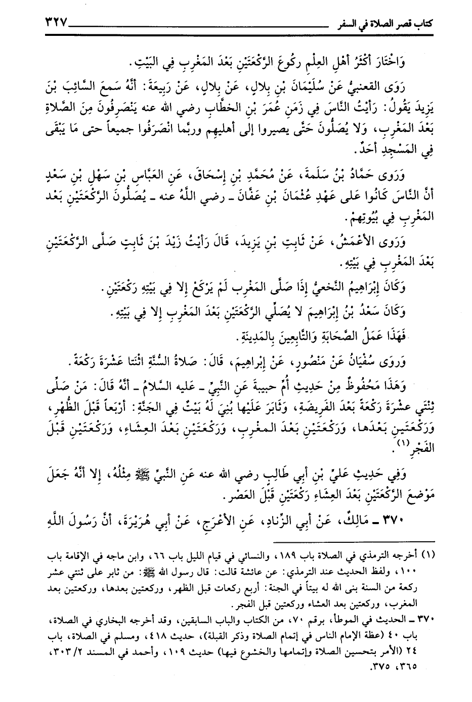 رَوَى الْقَعْنَبِيُّ عَنْ سُلَيْمَانَ بْنِ بِلَالٍ عَنْ بِلَالٍ عَنْ رَبِيعَةَ أَنَّهُ سَمِعَ السَّائِبَ بْنَ يَزِيدَ يَقُولُ رَأَيْتُ النَّاسَ فِي زَمَنِ عُمَرَ بْنِ الْخَطَّابِ رَضِيَ اللَّهُ عَنْهُ يَنْصَرِفُونَ مِنَ الصَّلَاةِ بَعْدَ الْمَغْرِبِ وَلَا يُصَلُّونَ حَتَّى يَصِيرُوا إِلَى أَهْلِيهِمْ وَرُبَّمَا انْصَرَفُوا جَمِيعًا حَتَّى مَا يَبْقَى فِي الْمَسْجِدِ أَحَدٌ