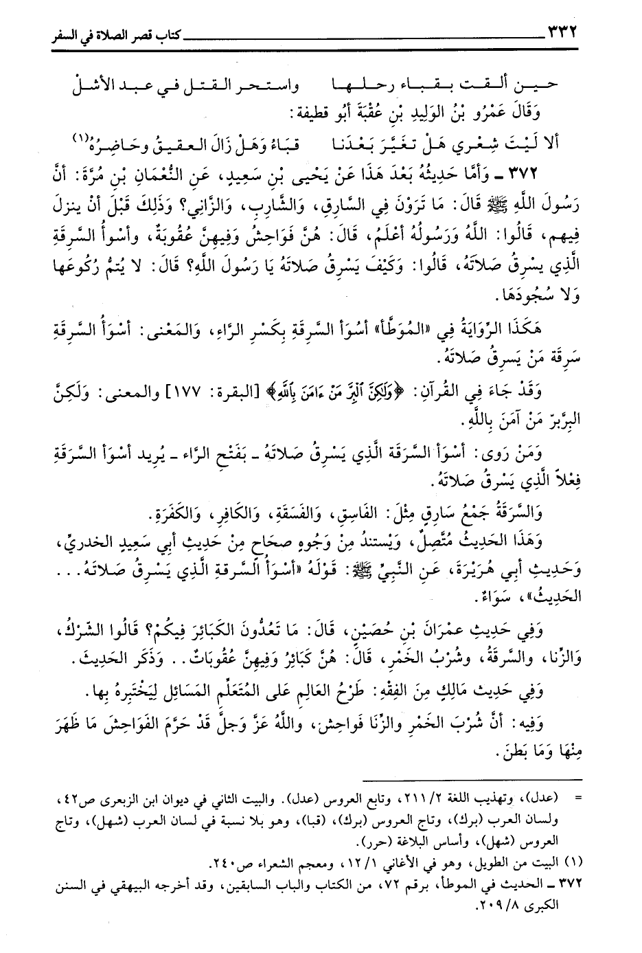 372 - وَأَمَّا حَدِيثُهُ بَعْدَ هَذَا عَنْ يَحْيَى بْنِ سَعِيدٍ عَنِ النُّعْمَانِ بْنِ مُرَّةَ أَنَّ رَسُولَ اللَّهِ صَلَّى اللَّهُ عَلَيْهِ وَسَلَّمَ قَالَ مَا تَرَوْنَ فِي السَّارِقِ وَالشَّارِبِ وَالزَّانِي وَذَلِكَ قَبْلَ أَنْ يَنْزِلَ فِيهِمْ قَالُوا اللَّهُ وَرَسُولُهُ أَعْلَمُ قَالَ هُنَّ فَوَاحِشُ وَفِيهِنَّ عُقُوبَةٌ وَأَسْوَأُ السَّرِقَةِ الَّذِي يَسْرِقُ صَلَاتَهُ قَالُوا وَكَيْفَ يَسْرِقُ صَلَاتَهُ يَا رَسُولَ اللَّهِ قَالَ لَا يُتِمُّ رُكُوعَهَا وَلَا سُجُودَهَا