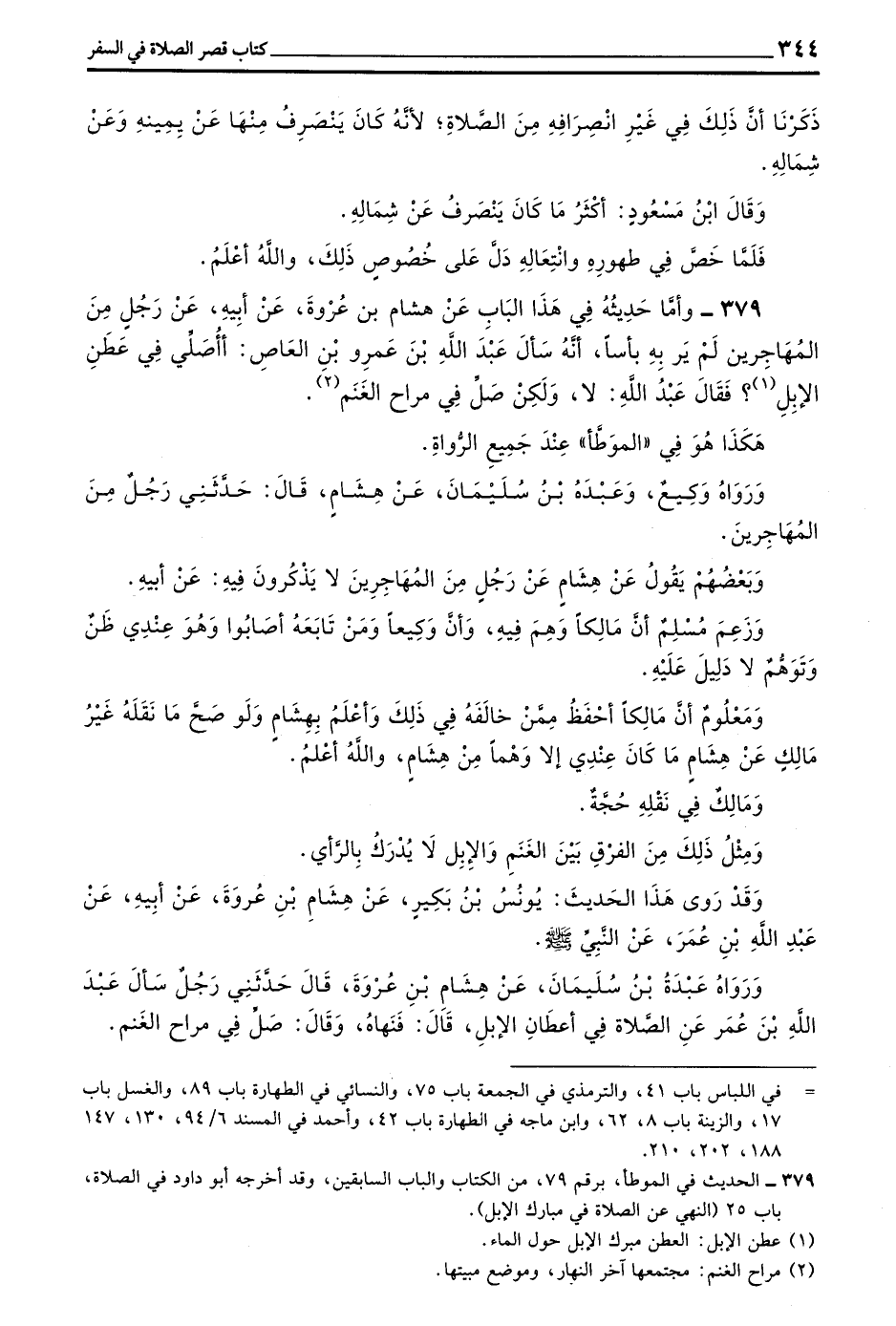 379 - وَأَمَّا حَدِيثُهُ فِي هَذَا الْبَابِ عَنْ هِشَامِ بْنِ عُرْوَةَ عَنْ أَبِيهِ عَنْ رَجُلٍ مِنَ الْمُهَاجِرِينَ لَمْ يَرَ بِهِ بَأْسًا أَنَّهُ سَأَلَ عَبْدَ اللَّهِ بْنَ عَمْرِو بْنِ الْعَاصِ أَأُصَلِّي فِي عَطَنِ الْإِبِلِ فَقَالَ عَبْدُ اللَّهِ لَا وَلَكِنْ صَلِّ فِي مُرَاحِ الْغَنَمِ