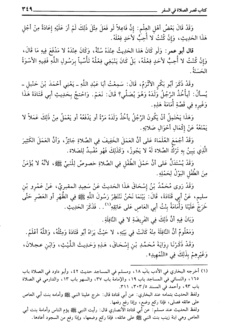 وَقَدْ ذَكَرَ أَبُو بَكْرٍ الْأَثْرَمُ قَالَ سَمِعْتُ أَبَا عَبْدِ اللَّهِ يَعْنِي أَحْمَدَ بْنَ حَنْبَلٍ يَسْأَلُ أَيَأْخُذُ الرَّجُلُ وَلَدَهُ وَهُوَ يُصَلِّي قَالَ نَعَمْ وَاحْتَجَّ بِحَدِيثِ أَبِي قَتَادَةَ هَذَا وَغَيْرِهِ فِي قِصَّةِ أُمَامَةَ هَذِهِ