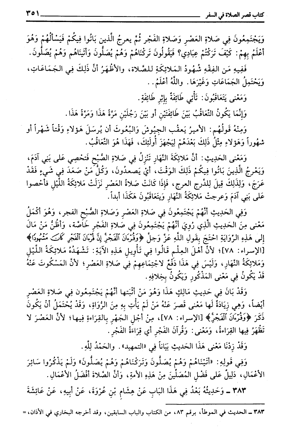 وَفِي الْحَدِيثِ أَنَّهُمْ يَجْتَمِعُونَ فِي صَلَاةِ الْعَصْرِ وَصَلَاةِ الصُّبْحِ الْفَجْرِ وَهُوَ أَكْمَلُ مَعْنًى مِنَ الْحَدِيثِ الَّذِي رُوِيَ أَنَّهُمْ يَجْتَمِعُونَ فِي صَلَاةِ الْفَجْرِ خَاصَّةً وَأَظُنُّ مِنْ مَالَ إِلَى هَذِهِ الرِّوَايَةِ احْتَجَّ بِقَوْلِ الله عز وجل (وقرءان الفجر إن قرءان الْفَجْرِ كَانَ مَشْهُودًا) الْإِسْرَاءِ 78 لِأَنَّ أَهْلَ الْعِلْمِ قَالُوا فِي تَأْوِيلِ هَذِهِ الْآيَةِ تَشْهَدُهُ مَلَائِكَةُ اللَّيْلِ وَمَلَائِكَةُ النَّهَارِ وَلَيْسَ فِي هَذَا دَفْعٌ لِاجْتِمَاعِهِمْ فِي صَلَاةِ الْعَصْرِ لِأَنَّ الْمَسْكُوتَ عَنْهُ قَدْ يَكُونُ فِي مَعْنَى الْمَذْكُورِ وَيَكُونُ بِخِلَافِهِ