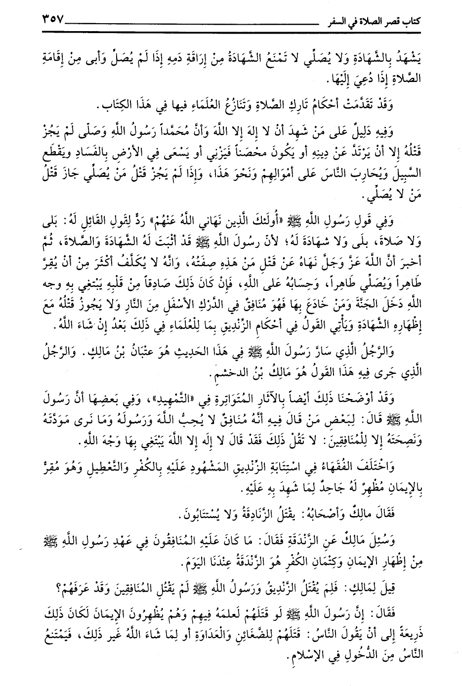 وَسُئِلَ مَالِكٌ عَنِ الزَّنْدَقَةِ فَقَالَ مَا كَانَ عَلَيْهِ الْمُنَافِقُونَ فِي عَهْدِ رَسُولِ اللَّهِ صَلَّى اللَّهُ عَلَيْهِ وَسَلَّمَ مِنْ إِظْهَارِ الْإِيمَانِ وَكِتْمَانِ الْكُفْرِ هُوَ الزَّنْدَقَةُ عِنْدَنَا الْيَوْمَ