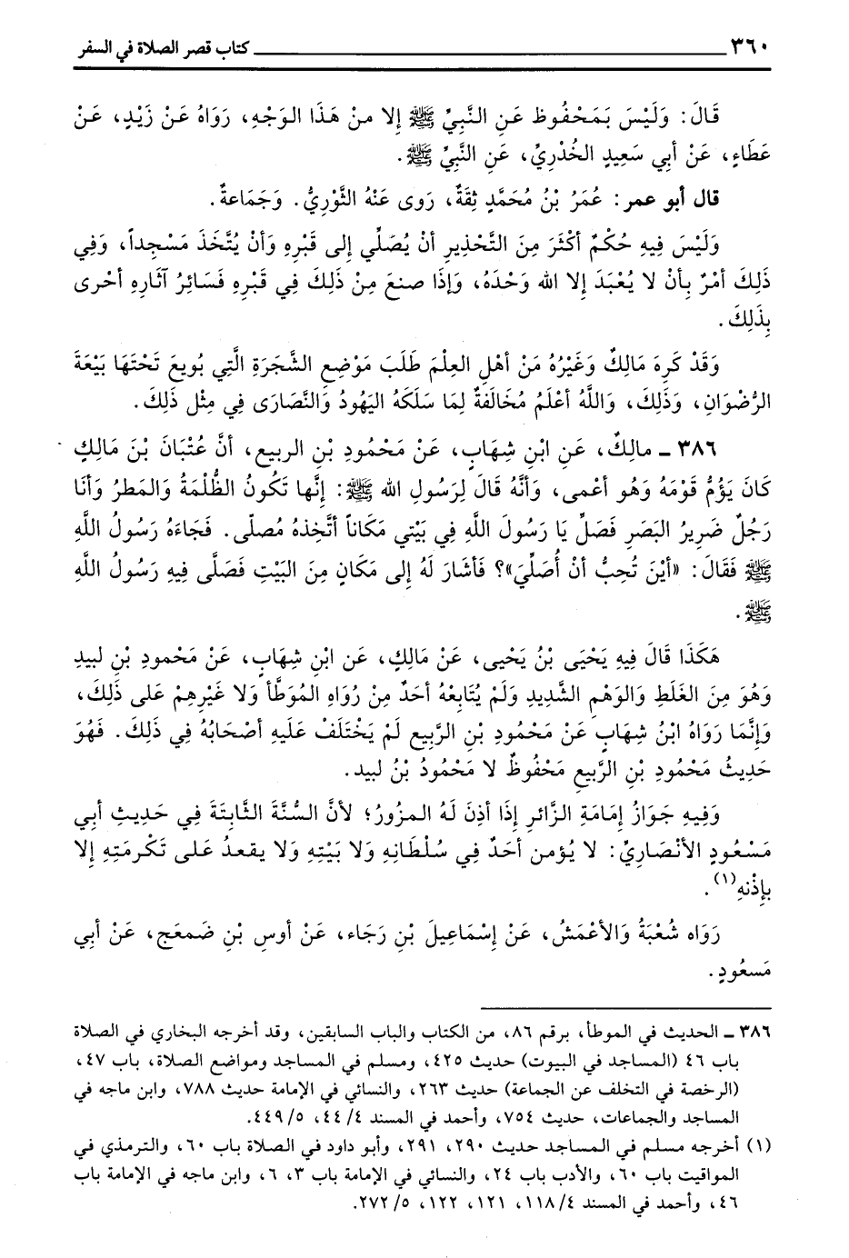 386 - مَالِكٌ عن بن شِهَابٍ عَنْ مَحْمُودِ بْنِ الرَّبِيعِ أَنَّ عِتْبَانَ بْنَ مَالِكٍ كَانَ يَؤُمُّ قَوْمَهُ وَهُوَ أَعْمَى وَأَنَّهُ قَالَ لِرَسُولِ اللَّهِ صَلَّى اللَّهُ عَلَيْهِ وَسَلَّمَ إِنَّهَا تَكُونُ الظُّلْمَةُ وَالْمَطَرُ وَأَنَا رَجُلٌ ضَرِيرُ الْبَصَرِ فَصَلِّ يَا رَسُولَ اللَّهِ فِي بَيْتِي مَكَانًا أَتَّخِذْهُ مُصَلًّى فَجَاءَهُ رَسُولُ اللَّهِ صَلَّى اللَّهُ عَلَيْهِ وَسَلَّمَ فَقَالَ أَيْنَ تُحِبُّ أَنْ أُصَلِّيَ فَأَشَارَ لَهُ إِلَى مَكَانٍ مِنَ الْبَيْتِ فَصَلَّى فِيهِ رَسُولُ اللَّهِ صَلَّى اللَّهُ عَلَيْهِ وَسَلَّمَ