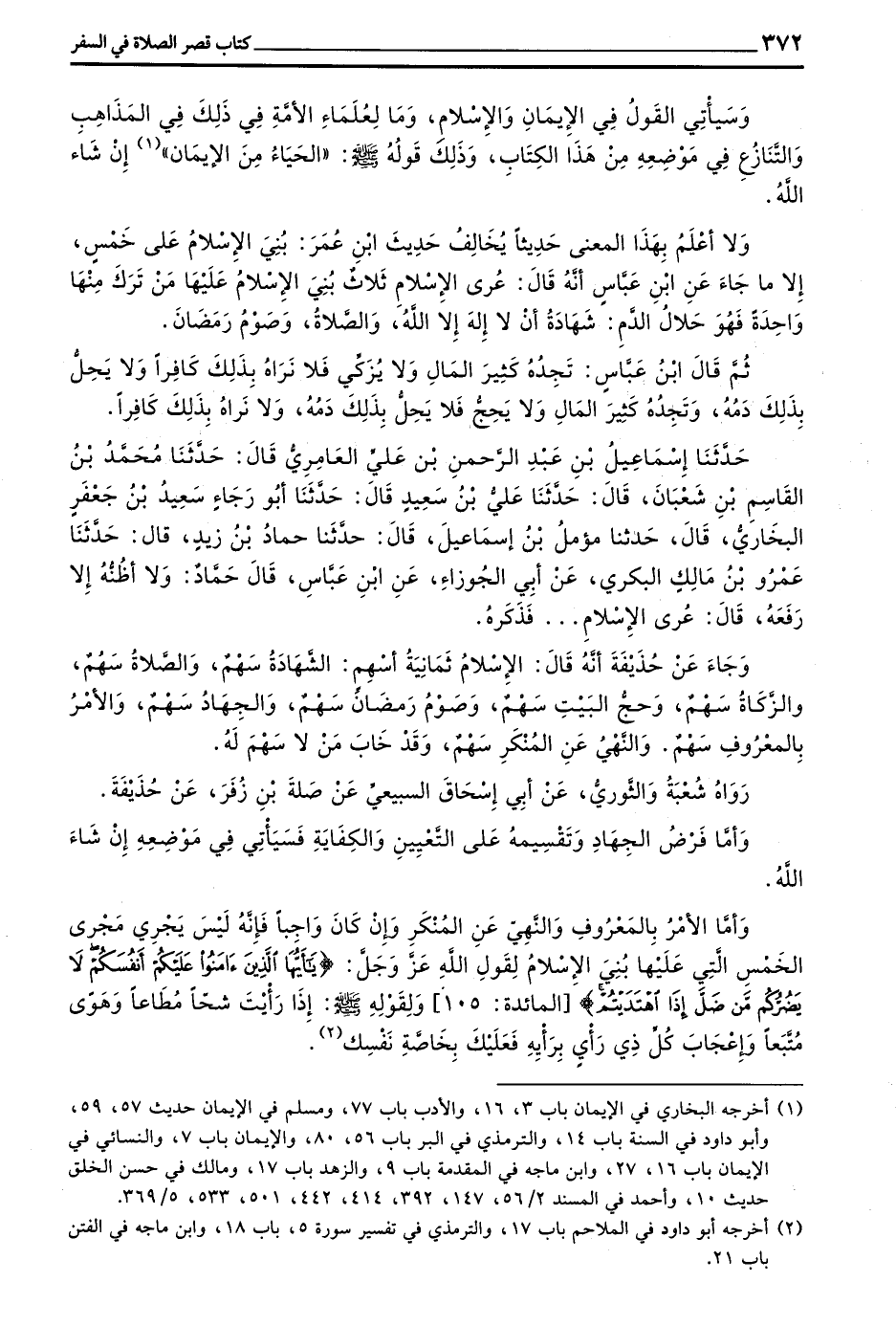وَأَمَّا الأمر بالمعروف والنهي عن المنكر وإن كان وَاجِبًا فَإِنَّهُ لَيْسَ يَجْرِي مَجْرَى الْخَمْسِ الَّتِي عَلَيْهَا بُنِيَ الْإِسْلَامُ لِقَوْلِ اللَّهِ عَزَّ وَجَلَّ (يأيها الذين ءامنوا عَلَيْكُمْ أَنْفُسَكُمْ لَا يَضُرُّكُمْ مَنْ ضَلَّ إِذَا اهْتَدَيْتُمْ) الْمَائِدَةِ 105 وَلِقَوْلِهِ صَلَّى اللَّهُ عَلَيْهِ وَسَلَّمَ إِذَا رَأَيْتَ شُحًّا مُطَاعًا وَهَوًى مُتَّبَعًا وَإِعْجَابَ كُلِّ ذِي رَأْيٍ بِرَأْيهِ فَعَلَيْكَ بِخَاصَّةِ نَفْسِكَ
