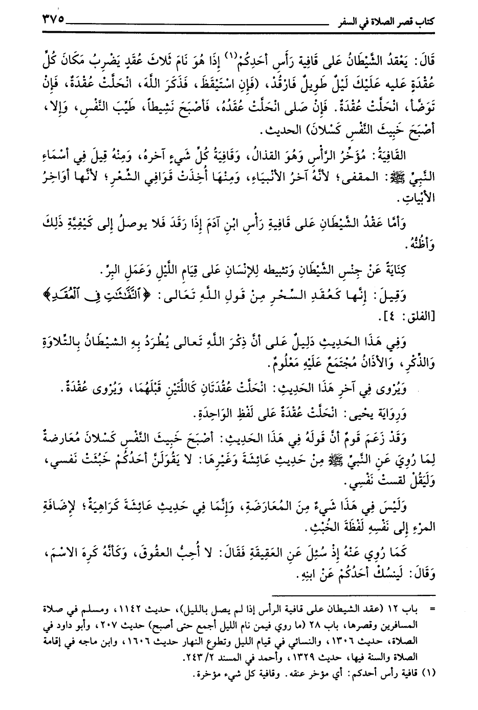 وَأَمَّا عَقْدُ الشَّيْطَانِ على قافية رأس بن آدَمَ إِذَا رَقَدَ فَلَا يُوصَلُ إِلَى كَيْفِيَّةِ ذَلِكَ وَأَظُنُّهُ