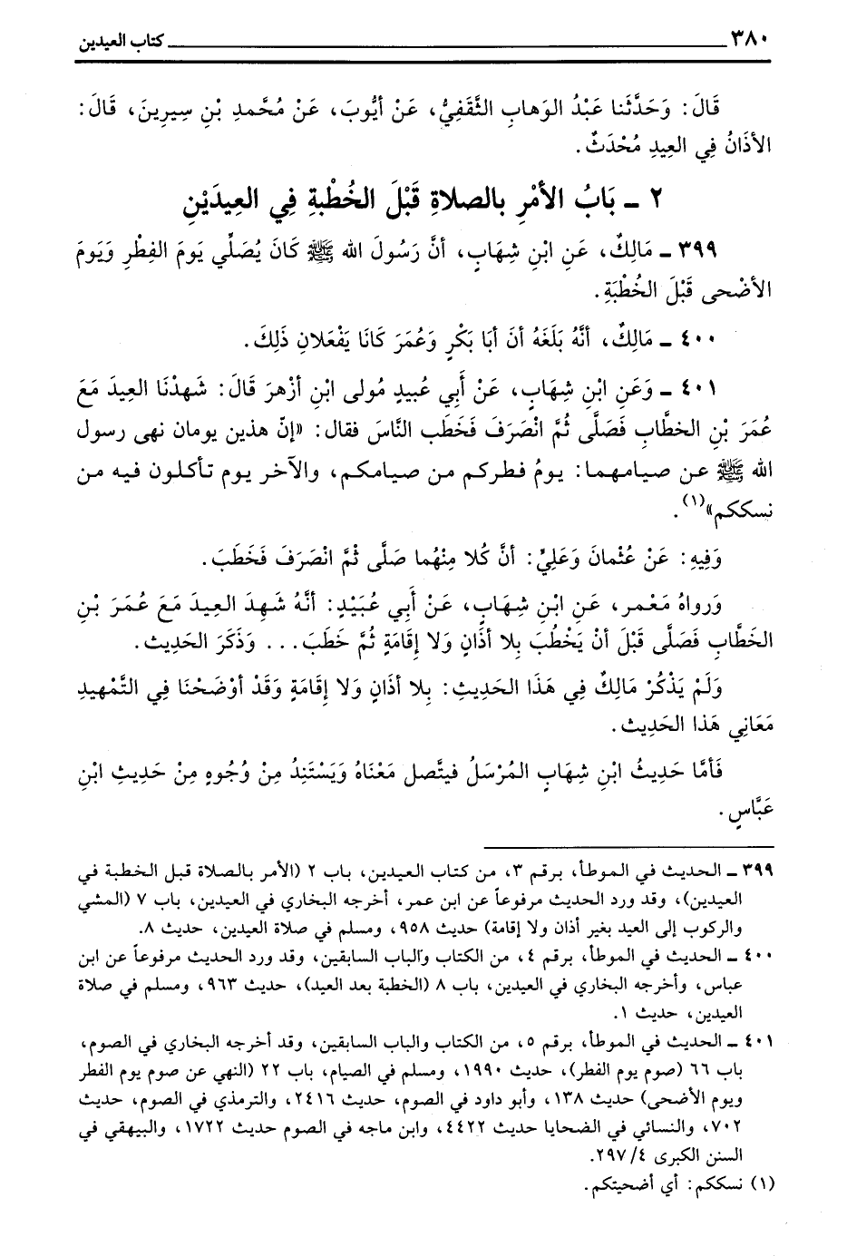 399 - مالك عن بن شِهَابٍ أَنَّ رَسُولَ اللَّهِ صَلَّى اللَّهُ عَلَيْهِ وَسَلَّمَ كَانَ يُصَلِّي يَوْمَ الْفِطْرِ وَيَوْمَ الْأَضْحَى قبل الخطبة
