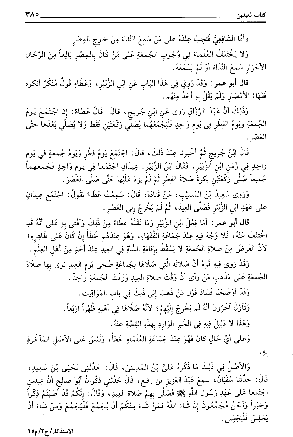 قال أبو عمر أما فعل بن الزُّبَيْرِ وَمَا نَقَلَهُ عَطَاءٌ مِنْ ذَلِكَ وَأَفْتَى بِهِ عَلَى أَنَّهُ قَدِ اخْتَلَفَ عَنْهُ فَلَا وَجْهَ فِيهِ عِنْدَ جَمَاعَةِ الْفُقَهَاءِ وَهُوَ عِنْدَهُمْ خَطَأٌ إِنْ كَانَ عَلَى ظَاهِرِهِ لِأَنَّ الْفَرْضَ مِنْ صَلَاةِ الْجُمُعَةِ لَا يَسْقُطُ بِإِقَامَةِ السُّنَّةِ فِي الْعِيدِ عِنْدَ أَحَدٍ مِنْ أَهْلِ الْعِلْمِ
