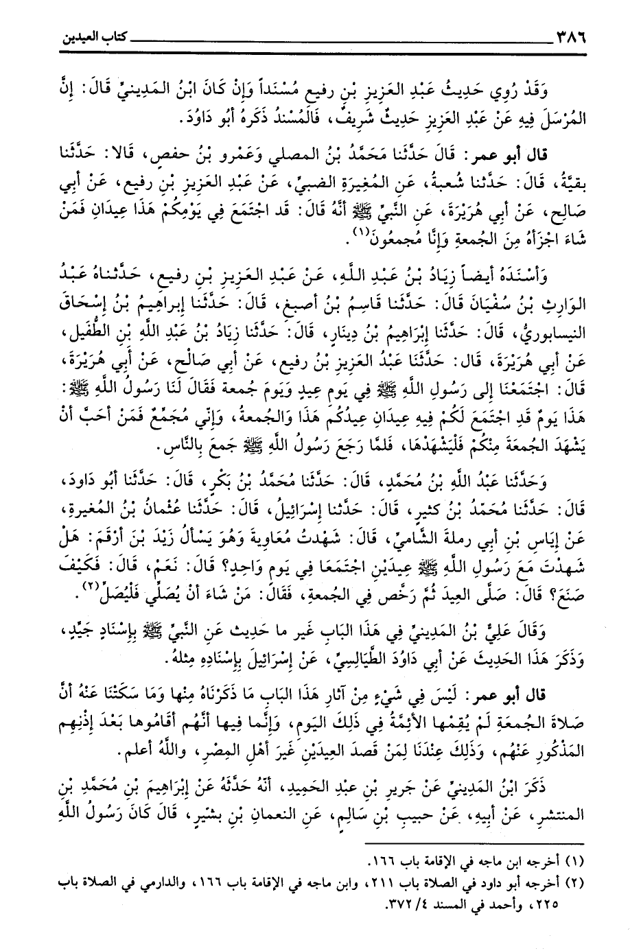 قَالَ أَبُو عُمَرَ قَالَ حَدَّثَنَا مُحَمَّدُ بْنُ الْمُصَلِّي وَعَمْرُو بْنُ حَفْصٍ قَالَا حَدَّثَنَا بَقِيَّةُ قَالَ حَدَّثْنَا شُعْبَةُ عَنِ الْمُغِيرَةِ الضَّبِّيِّ عَنْ عَبْدِ الْعَزِيزِ بْنِ رَفِيعٍ عَنْ أَبِي صَالِحٍ عَنْ أَبِي هُرَيْرَةَ عَنِ النَّبِيِّ صَلَّى اللَّهُ عَلَيْهِ وَسَلَّمَ أَنَّهُ قَالَ قَدِ اجْتَمَعَ فِي يَوْمِكُمْ هَذَا عِيدَانِ فَمَنْ شَاءَ أَجَزَّأَهُ مِنَ الْجُمُعَةِ وَإِنَّا مُجْمِعُونَ