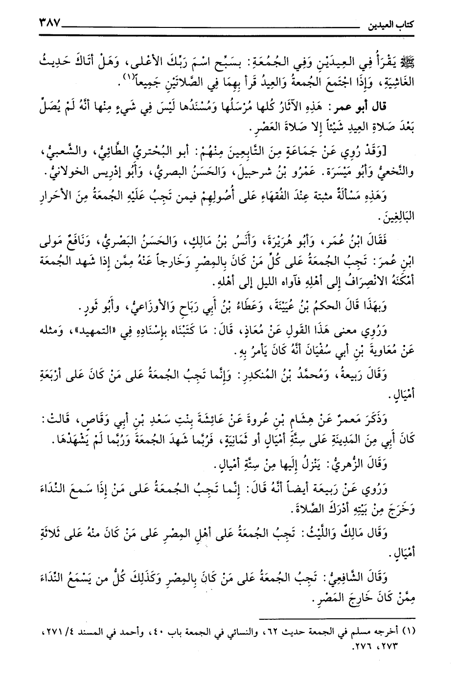 فقال بن عُمَرَ وَأَبُو هُرَيْرَةَ وَأَنَسُ بْنُ مَالِكٍ وَالْحَسَنُ البصري ونافع مولى بن عُمَرَ تَجِبُ الْجُمُعَةُ عَلَى كُلِّ مَنْ كَانَ بِالْمِصْرِ وَخَارِجًا عَنْهُ مِمَّنْ إِذَا شَهِدَ الْجُمُعَةَ أَمْكَنَهُ الِانْصِرَافُ إِلَى أَهْلِهِ فَآوَاهُ اللَّيْلُ إِلَى أَهْلِهِ