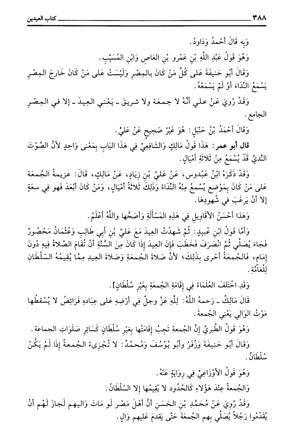 وأما قول بن عُبَيْدٍ ثُمَّ شَهِدْتُ الْعِيدَ مَعَ عَلِيِّ بْنِ أَبِي طَالِبٍ وَعُثْمَانُ مَحْصُورٌ فَجَاءَ يُصَلِّي ثُمَّ انْصَرَفَ فَخَطَبَ فَإِنَّ الْعِيدَ إِذَا كَانَ مِنَ السُّنَّةِ أَنْ تُقَامَ الصَّلَاةُ فِيهِ دُونَ إِمَامٍ فَالْجُمُعَةُ أَحْرَى بِذَلِكَ لِأَنَّ صَلَاةَ الْجُمُعَةِ وَصَلَاةَ الْعِيدِ مِمَّا يُقِيمُهُ السُّلْطَانُ لِلْعَامَّةِ