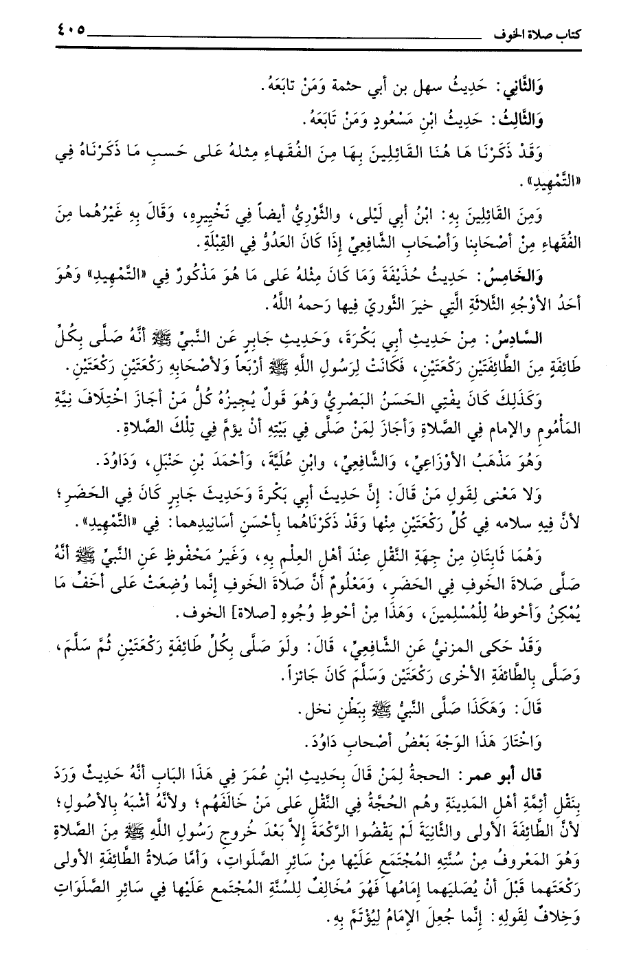 قَالَ أَبُو عُمَرَ الحجة لمن قال بحديث بن عُمَرَ فِي هَذَا الْبَابِ أَنَّهُ حَدِيثٌ وَرَدَ بِنَقْلِ أَئِمَّةِ أَهْلِ الْمَدِينَةِ وَهُمُ الْحُجَّةُ فِي النَّقْلِ عَلَى مَنْ خَالَفَهُمْ وَلِأَنَّهُ أَشْبَهَ بِالْأُصُولِ لأن الطائفة الأولى والثانية لم يقصوا الرَّكْعَةَ إِلَّا بَعْدَ خُرُوجِ رَسُولِ اللَّهِ صَلَّى اللَّهُ عَلَيْهِ وَسَلَّمَ مِنَ الصَّلَاةِ وَهُوَ الْمَعْرُوفُ مِنْ سُنَّتِهِ الْمُجْتَمَعِ عَلَيْهَا مِنْ سَائِرِ الصَّلَوَاتِ وَأَمَّا صَلَاةُ الطَّائِفَةِ الْأُولَى رَكْعَتَهُمَا قَبْلَ أَنْ يُصَلِّيَهُمَا إِمَامُهَا فَهُوَ مُخَالِفٌ لِلسُّنَّةِ الْمُجْتَمَعِ عَلَيْهَا فِي سَائِرِ الصَّلَوَاتِ وَخِلَافٌ لِقَوْلِهِ إِنَّمَا جُعِلَ الْإِمَامُ لِيُؤْتَمَّ بِهِ
