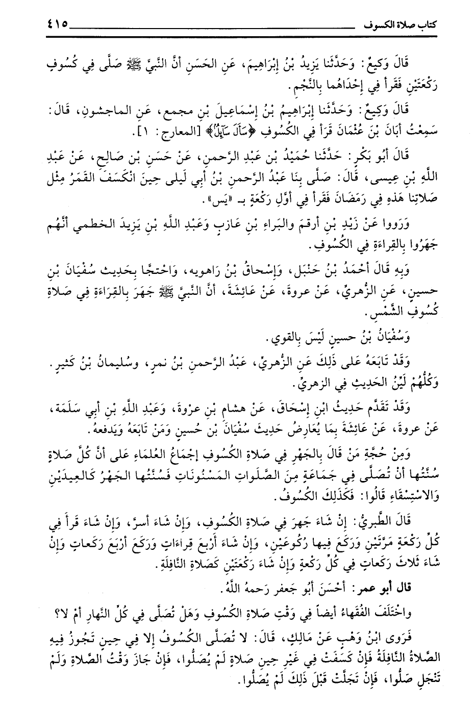 قَالَ أَبُو بَكْرٍ حَدَّثَنَا حُمَيْدُ بْنُ عَبْدِ الرَّحْمَنِ عَنْ حَسَنِ بْنِ صَالِحٍ عَنْ عَبْدِ اللَّهِ بْنِ عِيسَى قَالَ صَلَّى بِنَا عَبْدُ الرَّحْمَنِ بْنُ أَبِي لَيْلَى حِينَ انْكَسَفَ الْقَمَرُ مِثْلَ صِلَاتِنَا هَذِهِ فِي رَمَضَانَ فَقَرَأَ فِي أَوَّلِ رَكْعَةٍ بِ يس
