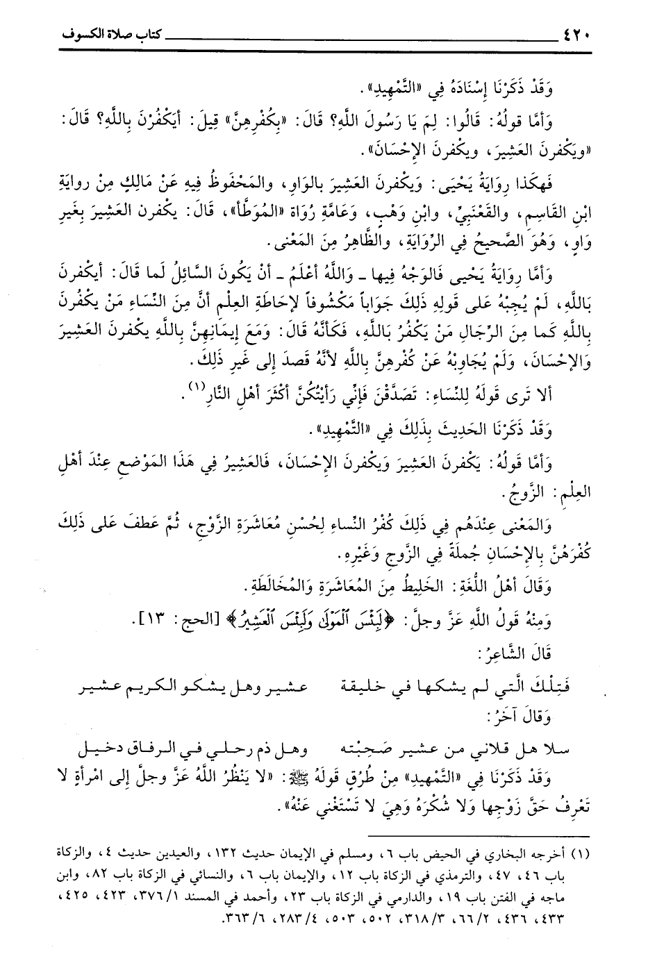 وَأَمَّا قَوْلُهُ يَكْفُرْنَ الْعَشِيرَ وَيَكْفُرْنَ الْإِحْسَانَ فَالْعَشِيرُ فِي هَذَا الْمَوْضِعِ عِنْدَ أَهْلِ الْعِلْمِ الزَّوْجُ