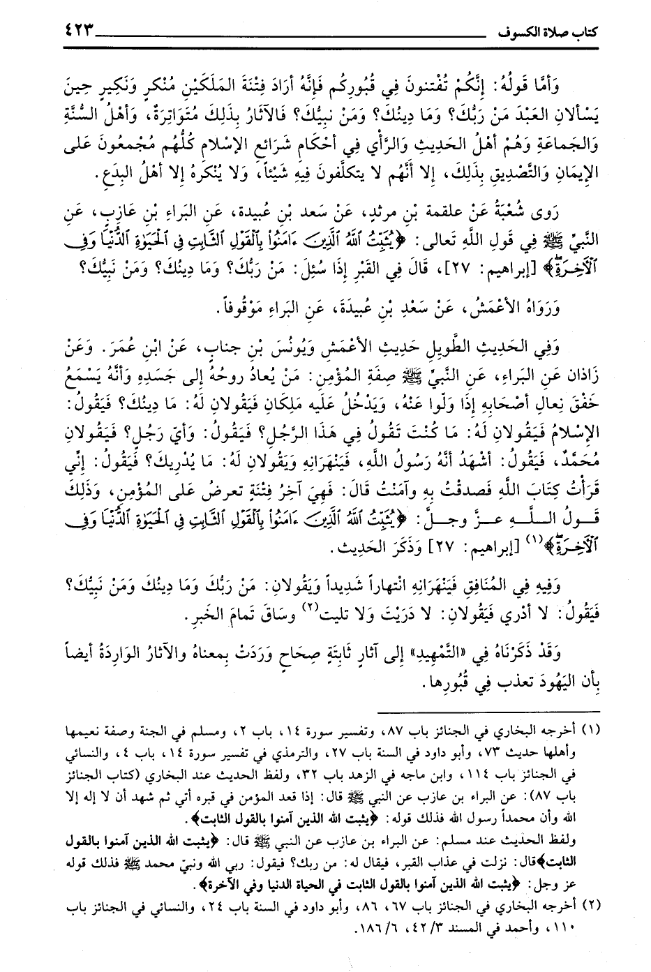 رَوَى شُعْبَةُ عَنْ عَلْقَمَةَ بْنِ مَرْثَدٍ عَنْ سَعْدِ بْنِ عُبَيْدَةَ عَنِ الْبَرَاءِ بْنِ عَازِبٍ عَنِ النَّبِيِّ صَلَّى اللَّهُ عَلَيْهِ وَسَلَّمَ فِي قَوْلِ اللَّهِ تَعَالَى (يُثَبِّتُ الله الذين ءامنوا بالقول الثابت في الحيوة الدُّنْيَا وَفِي الْأَخِرَةِ) إِبْرَاهِيمَ 27 قَالَ فِي الْقَبْرِ إِذَا سُئِلَ مَنْ رَبُّكَ وَمَا دِينُكَ وَمَنْ نَبِيُّكَ وَرَوَاهُ الْأَعْمَشُ عَنْ سَعْدِ بْنِ عُبَيْدَةَ عَنِ الْبَرَاءِ مَوْقُوفًا
