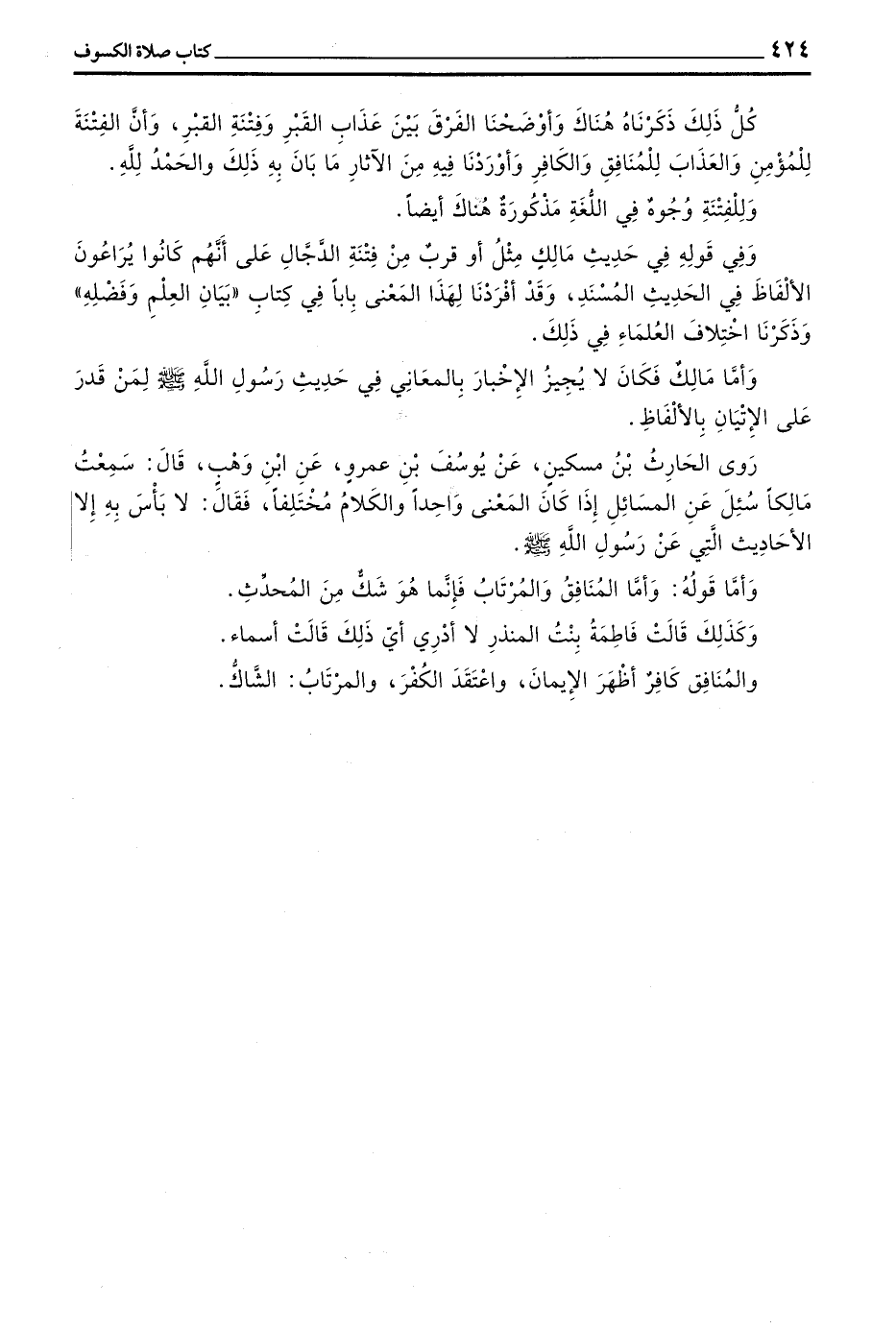 رَوَى الْحَارِثُ بْنُ مسكين عن يوسف بن عمرو عن بن وَهْبٍ قَالَ سَمِعْتُ مَالِكًا سُئِلَ عَنِ الْمَسَائِلِ إِذَا كَانَ الْمَعْنَى وَاحِدًا وَالْكَلَامُ مُخْتَلِفًا فَقَالَ لَا بَأْسَ بِهِ إِلَّا الْأَحَادِيثَ الَّتِي عَنْ رَسُولِ اللَّهِ صَلَّى اللَّهُ عَلَيْهِ وَسَلَّمَ