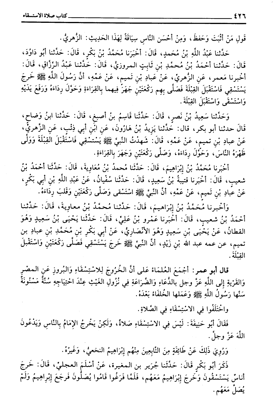 وَحَدَّثَنَا سَعِيدُ بْنُ نَصْرٍ قَالَ حَدَّثَنَا قَاسِمٌ بْنُ أَصْبَغَ قَالَ حَدَّثَنَا بْنُ وَضَّاحٍ قَالَ حَدَّثَنَا أَبُو بَكْرٍ قَالَ حَدَّثَنَا يزيد بن هارون عن بن أَبِي ذِئْبٍ عَنِ الزُّهْرِيِّ عَنْ عَبَّادِ بْنِ تَمِيمٍ عَنْ عَمِّهِ قَالَ شَهِدْتُ النَّبِيَّ صَلَّى اللَّهُ عَلَيْهِ وَسَلَّمَ يَسْتَسْقِي فَاسْتَقْبَلَ الْقِبْلَةَ وَوَلَّى ظَهْرَهُ النَّاسَ وَحَوَّلَ رِدَاءَهُ وَصَلَّى رَكْعَتَيْنِ وَجَهَرَ بِالْقِرَاءَةِ