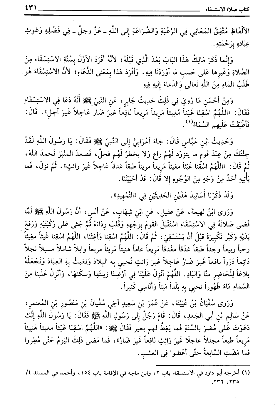 وَمِنْ أَحْسَنِ مَا رُوِيَ فِي ذَلِكَ حَدِيثُ جَابِرٍ عَنِ النَّبِيِّ صَلَّى اللَّهُ عَلَيْهِ وَسَلَّمَ أَنَّهُ دَعَا فِي الِاسْتِسْقَاءِ فَقَالَ اللهم اسقينا غَيْثًا مُغِيثًا مَرِيئًا مَرِيعًا نَافِعًا غَيْرَ ضَارٍّ عَاجِلًا غَيْرَ آجِلٍ قَالَ فَأَطْبَقَتْ عَلَيْهِمُ السَّمَاءُ