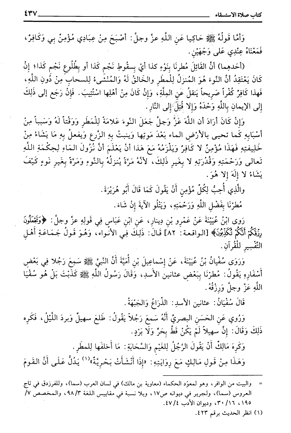 روى بْنُ عُيَيْنَةَ عَنْ عَمْرِو بْنِ دِينَارٍ عَنْ بن عَبَّاسٍ فِي قَوْلِهِ عَزَّ وَجَلَّ (وَتَجْعَلُونَ رِزْقَكُمْ أَنَّكُمْ تُكَذِّبُونَ) الْوَاقِعَةِ 82 قَالَ ذَلِكَ فِي الْأَنْوَاءِ وَهُوَ قَوْلُ جَمَاعَةِ أَهْلِ التَّفْسِيرِ لِلْقُرْآنِ