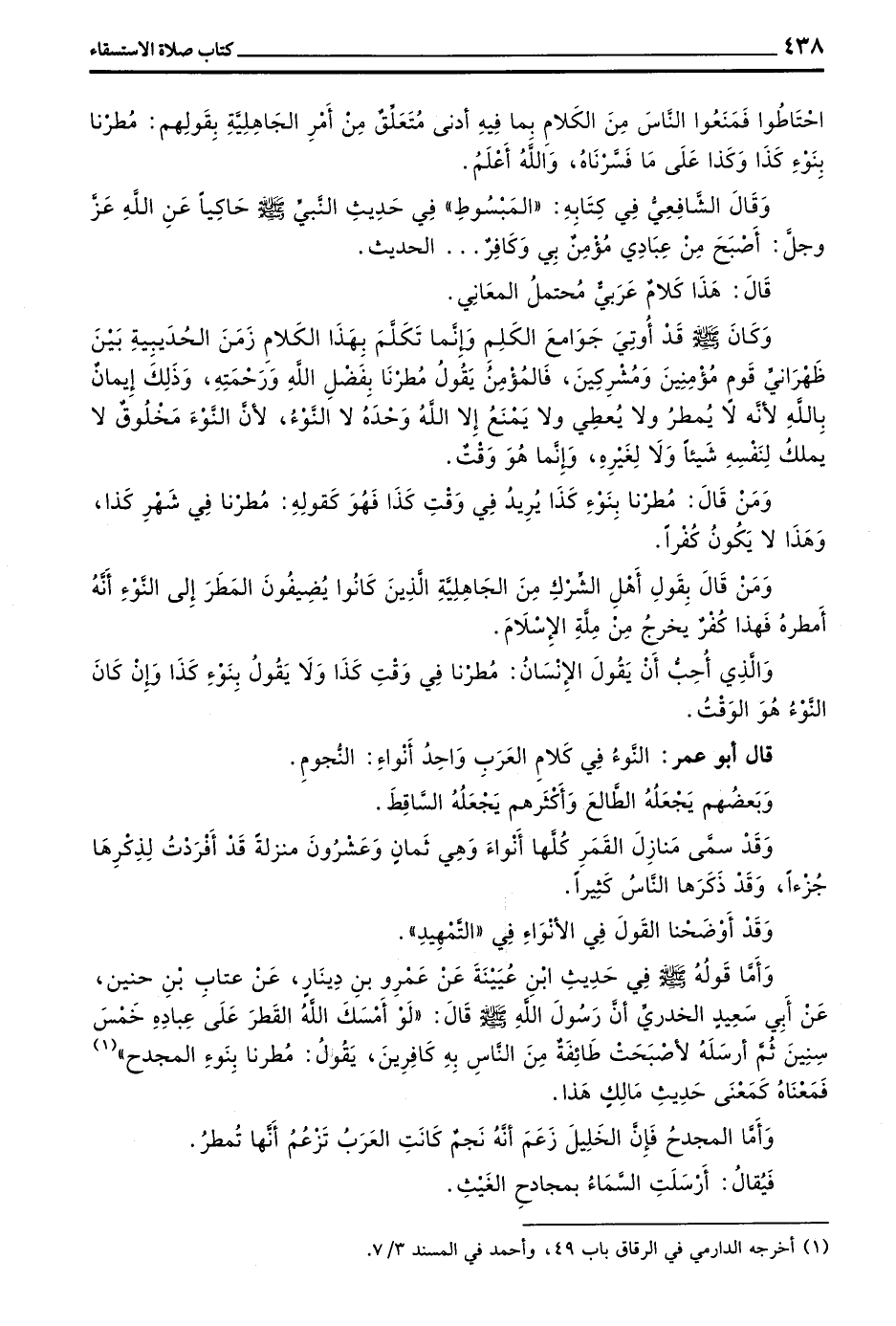 وَأَمَّا قَوْلُهُ صَلَّى اللَّهُ عَلَيْهِ وَسَلَّمَ فِي حَدِيثِ بْنُ عُيَيْنَةَ عَنْ عَمْرِو بْنِ دِينَارٍ عَنْ عَتَّابِ بْنِ حُنَيْنٍ عَنْ أَبِي سَعِيدٍ الْخُدْرِيِّ أَنَّ رَسُولَ اللَّهِ صلى الله عليه وسلم قَالَ لَوْ أَمْسَكَ اللَّهُ الْقَطْرَ عَلَى عِبَادِهِ خَمْسَ سِنِينَ ثُمَّ أَرْسَلَهُ لَأَصْبَحَتْ طَائِفَةٌ مِنَ النَّاسِ بِهِ كَافِرِينَ يَقُولُ مُطِرْنَا بِنَوْءِ الْمِجْدَحِ فَمَعْنَاهُ كَمَعْنَى حَدِيثِ مَالِكٍ هَذَا