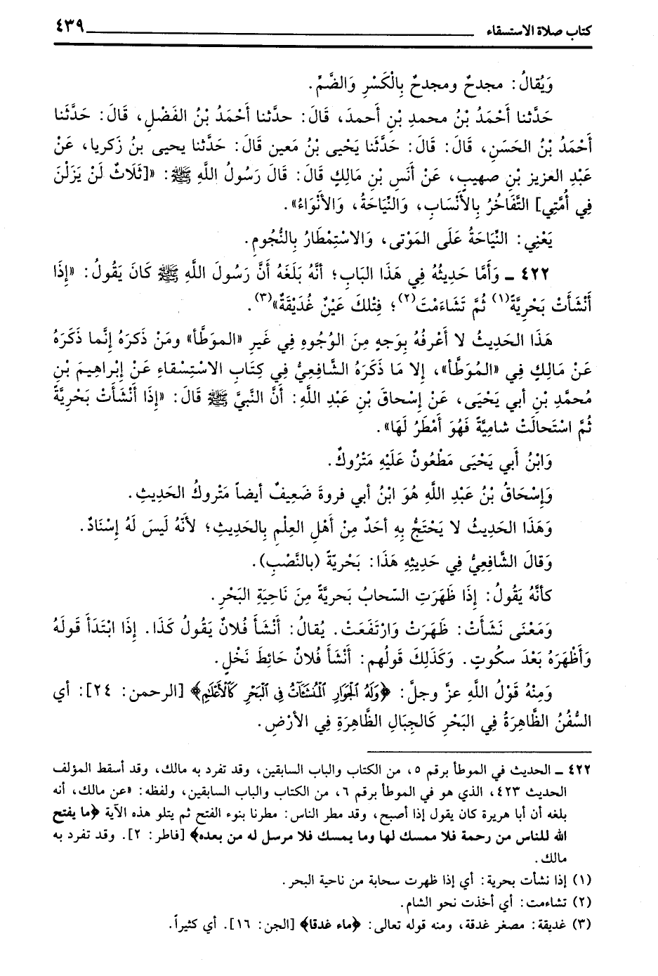 422 - وَأَمَّا حَدِيثُهُ فِي هَذَا الْبَابِ أَنَّهُ بَلَغَهُ أَنَّ رَسُولَ اللَّهِ صَلَّى اللَّهُ عَلَيْهِ وَسَلَّمَ كَانَ يَقُولُ إِذَا أَنْشَأَتْ بِحْرِيَّةً ثُمَّ تَشَاءَمَتْ فَتِلْكَ عَيْنٌ غُدَيْقَةٌ