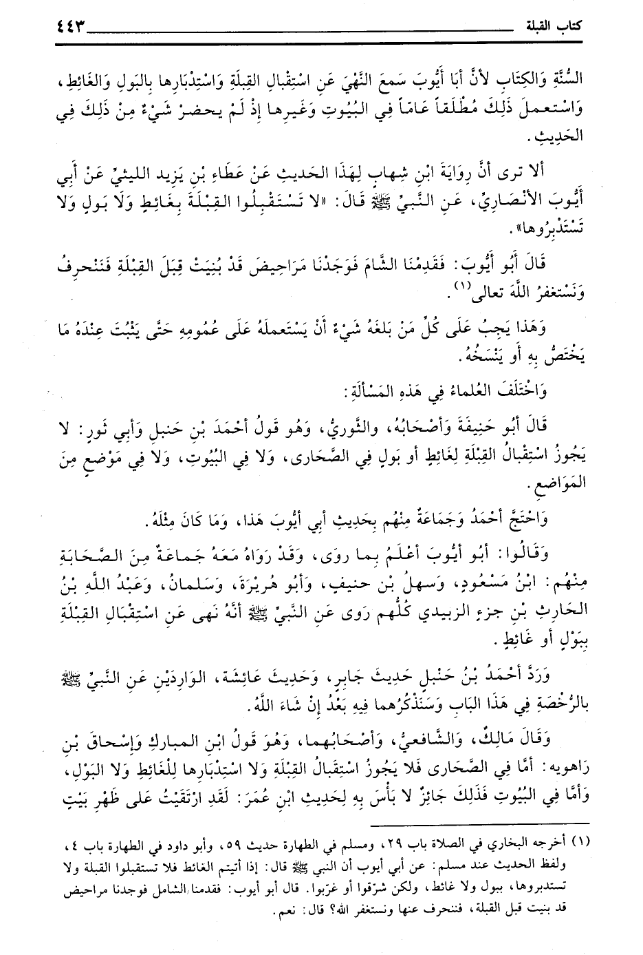 السُّنَّةِ وَالْكِتَابِ لِأَنَّ أَبَا أَيُّوبَ سَمِعَ النَّهْيَ عَنِ اسْتِقْبَالِ الْقِبْلَةِ وَاسْتِدْبَارِهَا بِالْبَوْلِ وَالْغَائِطِ وَاسْتَعْمَلَ ذَلِكَ مُطْلَقًا عَامًّا فِي الْبُيُوتِ وَغَيْرِهَا إِذْ لَمْ يَحْضُرْ شَيْءٌ مِنْ ذَلِكَ فِي الْحَدِيثِ