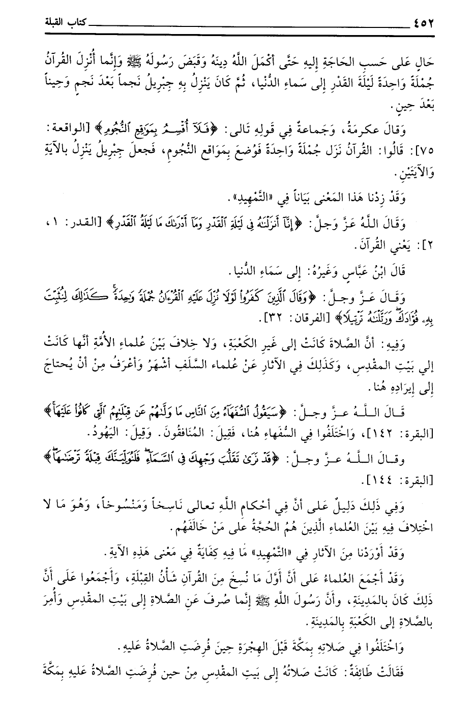 وَقَدْ أَجْمَعَ الْعُلَمَاءُ عَلَى أَنَّ أَوَّلَ مَا نُسِخَ مِنَ الْقُرْآنِ شَأْنُ الْقِبْلَةِ وَأَجْمَعُوا عَلَى أَنَّ ذَلِكَ كَانَ بِالْمَدِينَةِ وَأَنَّ رَسُولَ اللَّهِ صَلَّى اللَّهُ عَلَيْهِ وَسَلَّمَ إِنَّمَا صُرِفَ عَنِ الصَّلَاةِ إِلَى بَيْتِ الْمَقْدِسِ وَأُمِرَ بِالصَّلَاةِ إِلَى الْكَعْبَةِ بِالْمَدِينَةِ