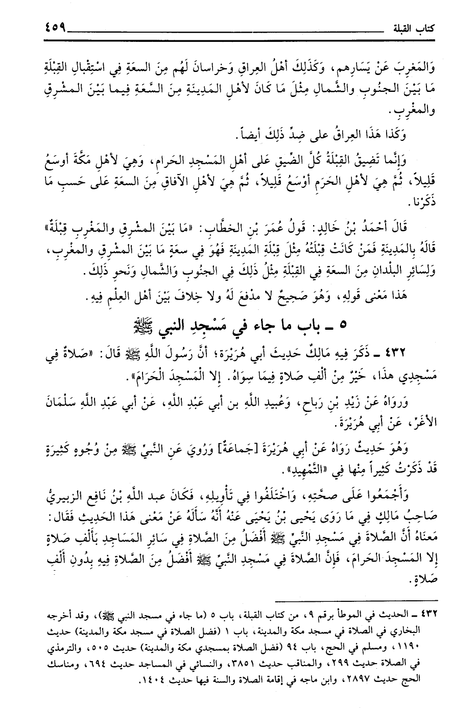 (5 باب ما جاء في المسجد النَّبِيِّ صَلَّى اللَّهُ عَلَيْهِ وَسَلَّمَ 432 ذَكَرَ فِيهِ مَالِكٌ حَدِيثَ أَبِي هُرَيْرَةَ أَنَّ رَسُولَ اللَّهِ صَلَّى اللَّهُ عَلَيْهِ وَسَلَّمَ قَالَ صَلَاةٌ فِي مَسْجِدِي هَذَا خَيْرٌ مِنْ أَلْفِ صَلَاةٍ فِيمَا سِوَاهُ إِلَّا الْمَسْجِدَ الْحَرَامَ)