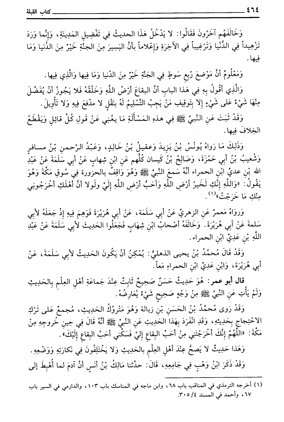 وَقَدْ رَوَى مُحَمَّدُ بْنُ الْحَسَنِ بْنُ زَبَالَةَ وَهُوَ مَتْرُوكُ الْحَدِيثِ مُجْمَعٌ عَلَى تَرْكِ الِاحْتِجَاجِ بِحَدِيثِهِ وَقَدِ انْفَرَدَ بِهَذَا الْحَدِيثِ عَنِ النَّبِيِّ صَلَّى اللَّهُ عَلَيْهِ وَسَلَّمَ أَنَّهُ قَالَ فِي حِينِ خُرُوجِهِ مِنْ مَكَّةَ اللَّهُمَّ إِنَّكَ أَخْرَجْتَنِي مِنْ أَحَبِّ الْبِقَاعِ إِلَيَّ فَسَكِّنِي أَحَبَّ الْبِقَاعِ إِلَيْكَ
