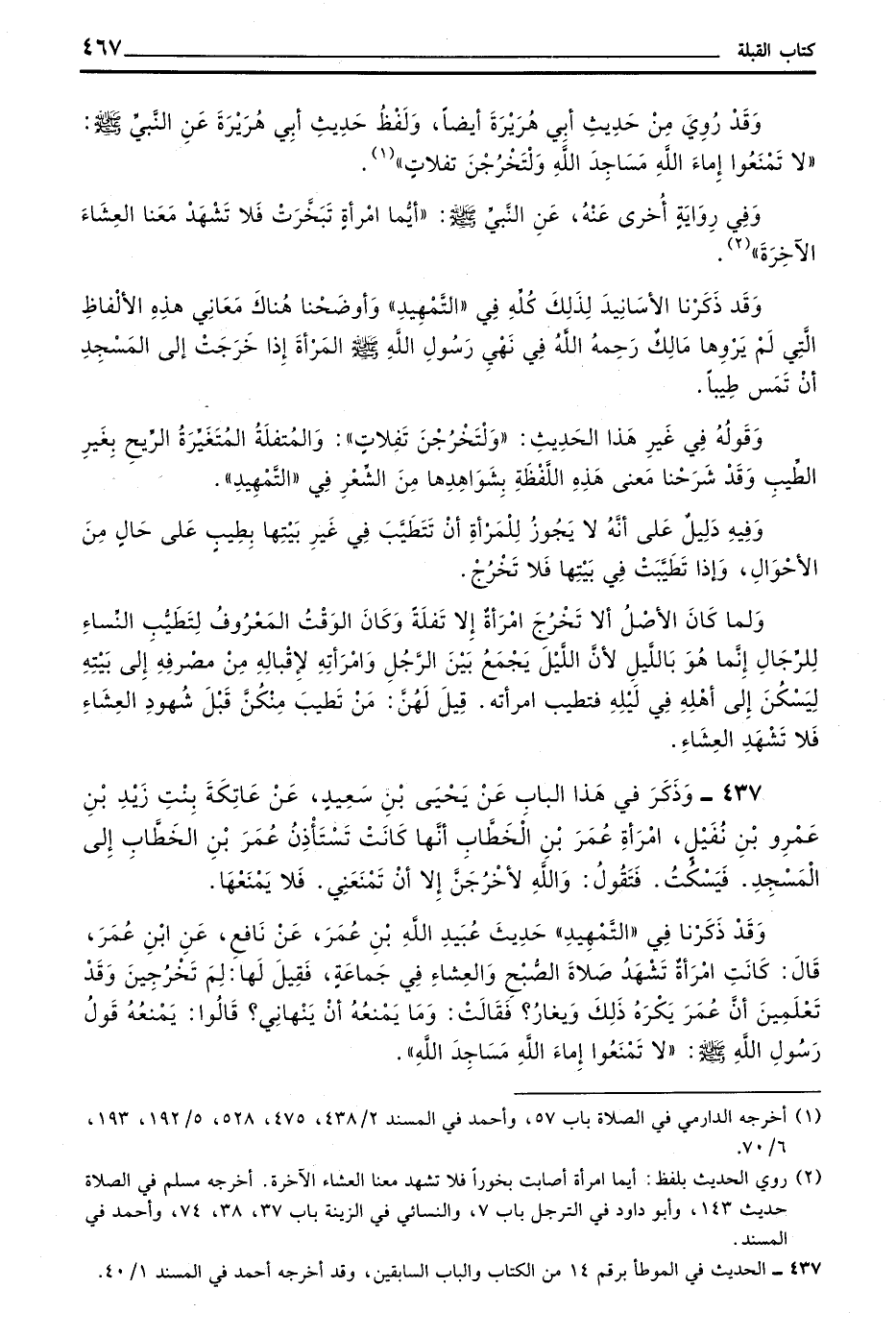 وَقَدْ ذَكَرْنَا فِي التَّمْهِيدِ حَدِيثُ عُبَيْدِ اللَّهِ بْنِ عُمَرَ عَنْ نَافِعٍ عن بن عُمَرَ قَالَ كَانَتِ امْرَأَةٌ تَشْهَدُ صَلَاةَ الصُّبْحِ وَالْعِشَاءِ فِي جَمَاعَةٍ فَقِيلَ لَهَا لِمَ تَخْرُجِينَ وَقَدْ تَعْلَمِينَ أَنَّ عُمَرَ يَكْرَهُ ذَلِكَ وَيَغَارُ فَقَالَتْ وَمَا يَمْنَعُهُ أَنْ يَنْهَانِي قَالُوا يَمْنَعُهُ قول رسول الله صلى الله عليه وسلم لَا تَمْنَعُوا إِمَاءَ اللَّهِ مَسَاجِدَ اللَّهِ