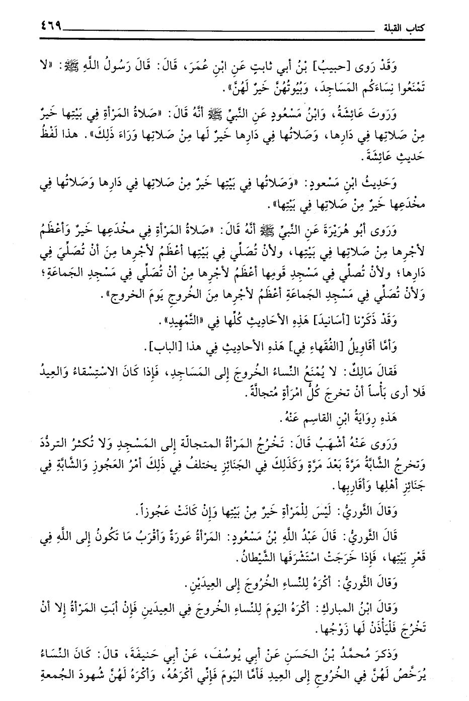 وَرَوَى أَبُو هُرَيْرَةَ عَنِ النَّبِيِّ صَلَّى اللَّهُ عَلَيْهِ وَسَلَّمَ أَنَّهُ قَالَ صَلَاةُ الْمَرْأَةِ فِي مَخْدَعِهَا خَيْرٌ وَأَعْظَمٌ لِأَجْرِهَا مِنْ صَلَاتِهَا فِي بَيْتِهَا وَلِأَنْ تُصَلِّيَ فِي بَيْتِهَا أَعْظَمُ لِأَجْرِهَا مِنْ أَنْ تُصَلِّيَ فِي دَارِهَا وَلِأَنْ تُصَلِّيَ فِي مَسْجِدِ قَوْمِهَا أَعْظَمُ لِأَجْرِهَا مِنْ أَنْ تُصَلِّيَ فِي مَسْجِدِ الْجَمَاعَةِ وَلِأَنْ تُصَلِّيَ فِي مَسْجِدِ الْجَمَاعَةِ أَعْظَمُ لِأَجْرِهَا مِنَ الْخُرُوجِ يَوْمَ الْخُرُوجِ