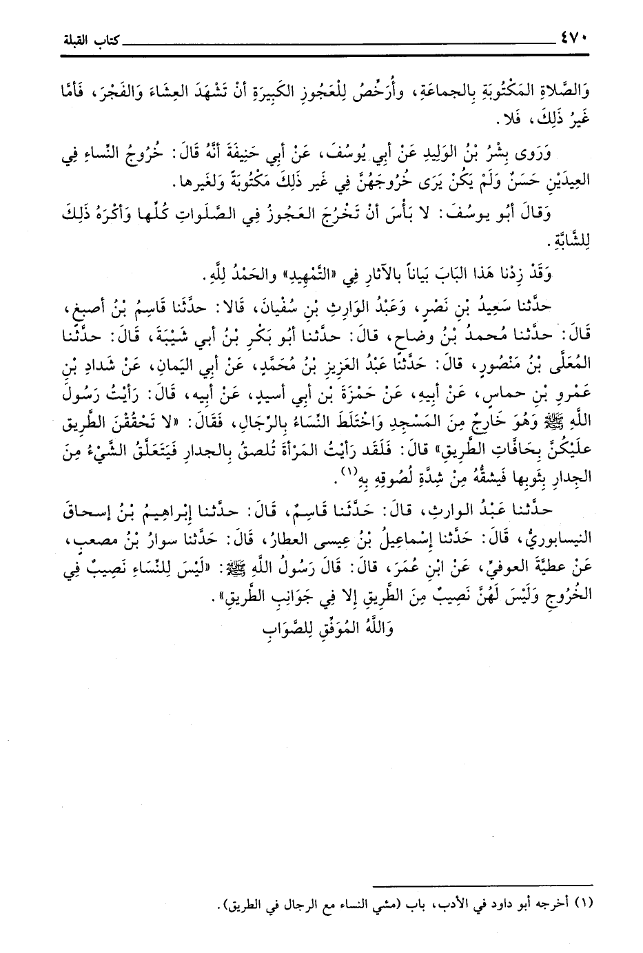 حَدَّثَنَا سَعِيدُ بْنُ نَصْرٍ وَعَبْدُ الْوَارِثِ بْنُ سُفْيَانَ قَالَا حَدَّثَنَا قَاسِمُ بْنُ أَصْبَغَ قَالَ حَدَّثَنَا مُحَمَّدُ بْنُ وَضَّاحٍ قَالَ حَدَّثَنَا أَبُو بَكْرِ بْنُ أَبِي شَيْبَةَ قَالَ حَدَّثَنَا الْمُعَلَّى بْنُ مَنْصُورٍ قَالَ حَدَّثَنَا عَبْدُ الْعَزِيزِ بْنُ مُحَمَّدٍ عَنْ أَبِي الْيَمَانِ عَنْ شَدَّادِ بْنِ عَمْرِو بْنِ حَمَاسٍ عَنْ أَبِيهِ عَنْ حَمْزَةَ بْنِ أَبِي أُسِيدٍ عَنْ أَبِيهِ قَالَ رَأَيْتُ رَسُولَ اللَّهِ صَلَّى اللَّهُ عَلَيْهِ وسلم وَهُوَ خَارِجٌ مِنَ الْمَسْجِدِ وَاخْتَلَطَ النِّسَاءُ بِالرِّجَالِ فَقَالَ لَا تَحْقُقْنَ الطَّرِيقَ عَلَيْكُنَّ بِحَافَّاتِ الطَّرِيقِ قَالَ فَلَقَدْ رَأَيْتُ الْمَرْأَةَ تُلْصَقُ بِالْجِدَارِ فَيَتَعَلَّقُ الشَّيْءُ مِنَ الْجِدَارِ بِثَوْبِهَا فَيَشُقُّهُ مِنْ شِدَّةِ لُصُوقِهِ بِهِ
