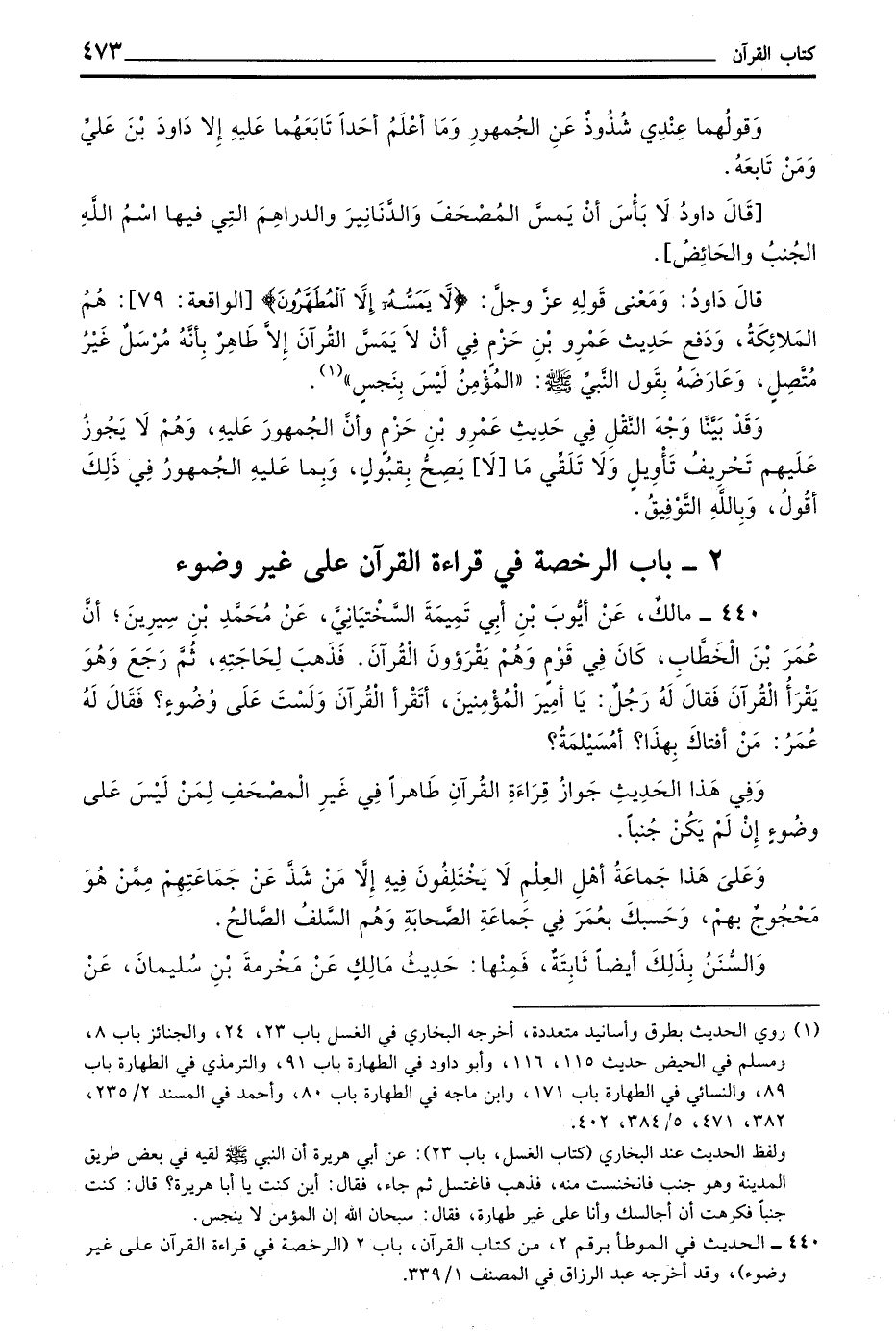قَالَ دَاوُدُ وَمَعْنَى قَوْلِهِ عز وجل (لا يمسه إلا المطهرون) الْوَاقِعَةِ 79 هُمُ الْمَلَائِكَةُ وَدَفَعَ حَدِيثَ عَمْرِو بْنِ حَزْمٍ فِي أَنْ لَا يَمَسَّ الْقُرْآنَ إِلَّا طَاهِرٌ بِأَنَّهُ مُرْسَلٌ غَيْرُ مُتَّصِلٍ وَعَارَضَهُ بِقَوْلِ النَّبِيِّ صَلَّى اللَّهُ عَلَيْهِ وَسَلَّمَ الْمُؤْمِنُ لَيْسَ بِنَجَسٍ