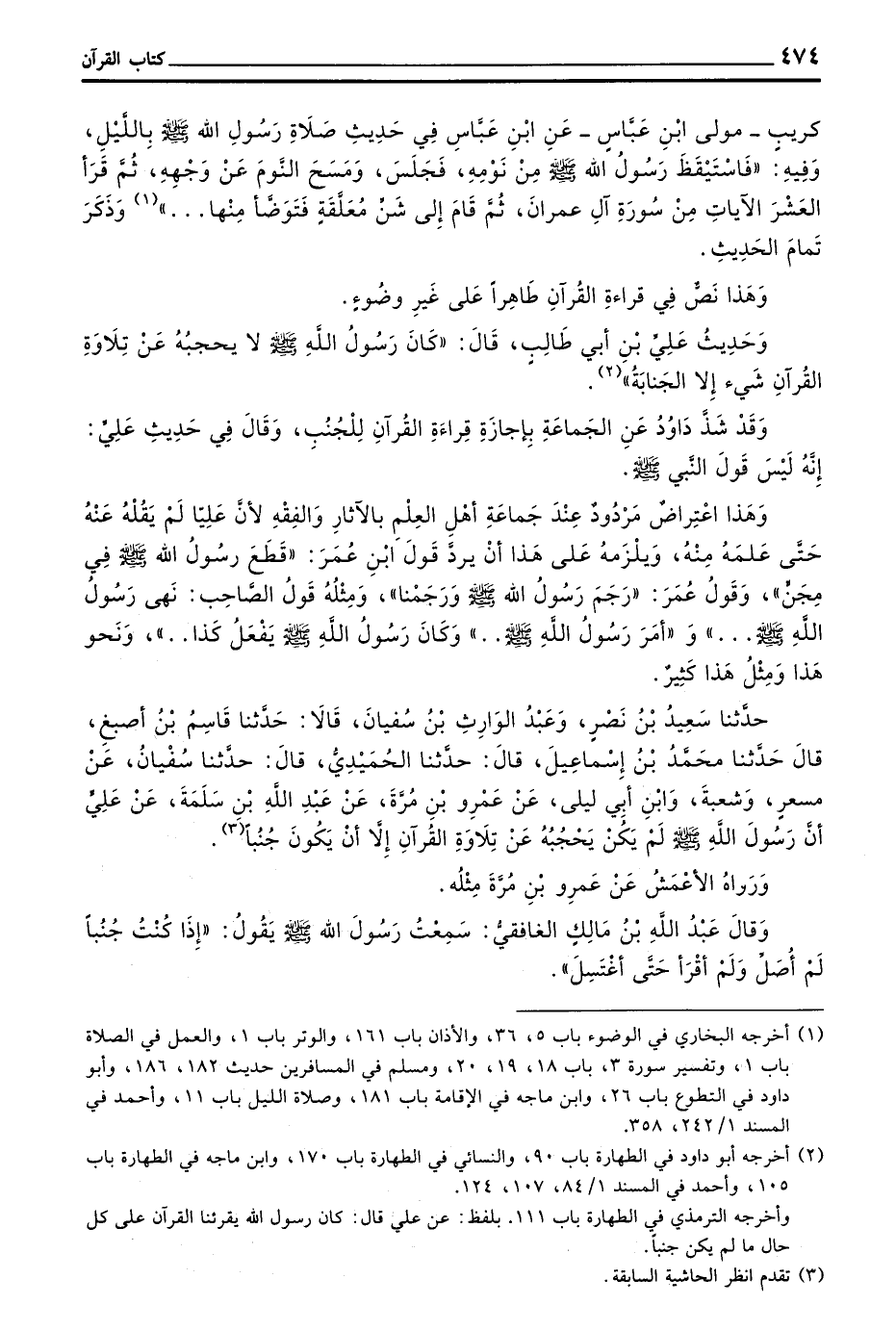 حَدَّثَنَا سَعِيدُ بْنُ نَصْرٍ وَعَبْدُ الْوَارِثِ بْنُ سُفْيَانَ قَالَا حَدَّثَنَا قَاسِمُ بْنُ أَصْبَغَ قَالَ حَدَّثَنَا مُحَمَّدُ بْنُ إِسْمَاعِيلَ قَالَ حَدَّثَنَا الْحُمَيْدِيُّ قَالَ حدثنا سفيان عن مسعر وشعبة وبن أَبِي لَيْلَى عَنْ عَمْرِو بْنِ مُرَّةَ عَنْ عَبْدِ اللَّهِ بْنِ سَلَمَةَ عَنْ عَلَى أَنَّ رَسُولَ اللَّهِ صَلَّى اللَّهُ عَلَيْهِ وسلم لم يَكُنْ يَحْجُبُهُ عَنْ تِلَاوَةِ الْقُرْآنِ إِلَّا أَنْ يَكُونَ جُنُبًا