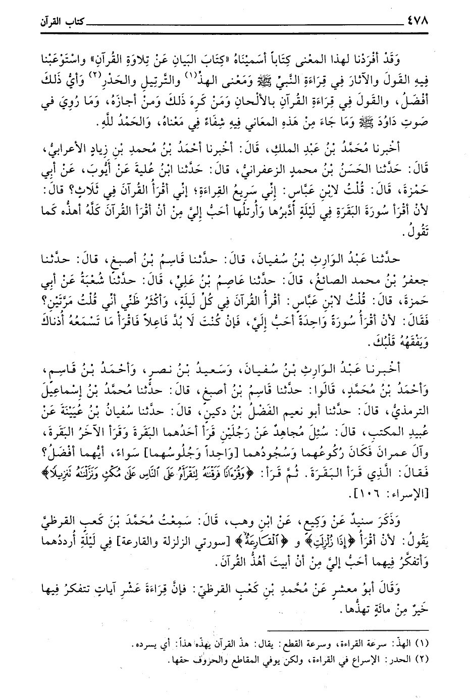 أَخْبَرَنَا عَبْدُ الْوَارِثِ بْنُ سُفْيَانَ وَسَعِيدُ بْنُ نَصْرٍ وَأَحْمَدُ بْنُ قَاسِمٍ وَأَحْمَدُ بْنُ مُحَمَّدٍ قَالُوا حَدَّثَنَا قَاسِمُ بْنُ أَصْبَغَ قَالَ حَدَّثَنَا مُحَمَّدُ بْنُ إِسْمَاعِيلَ التِّرْمِذِيُّ قَالَ حَدَّثَنَا أَبُو نُعَيْمٍ الْفَضْلُ بْنُ دُكَيْنٍ قَالَ حَدَّثَنَا سُفْيَانُ بْنُ عُيَيْنَةَ عَنْ عُبَيْدٍ الْمُكْتِبِ قَالَ سُئِلَ مُجَاهِدٌ عَنْ رَجُلَيْنِ قَرَأَ أَحَدُهُمَا الْبَقَرَةَ وَقَرَأَ الْآخَرُ الْبَقَرَةَ وَآلَ عِمْرَانَ فَكَانَ رُكُوعُهُمَا وَسُجُودُهُمَا وَاحِدًا وَجُلُوسُهُمَا سَوَاءً أَيُّهُمَا أَفْضَلُ فَقَالَ الَّذِي قَرَأَ الْبَقَرَةَ ثُمَّ قرأ (وقرءانا فرقنه لتقرأه على الناس على مكث ونزلنه تنزيلا) الإسراء 106