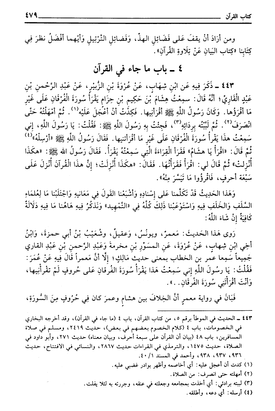443 - ذكر فيه عن بن شِهَابٍ عَنْ عُرْوَةَ بْنِ الزُّبَيْرِ عَنْ عَبْدِ الرَّحْمَنِ بْنِ عَبْدٍ الْقَارِئُ أَنَّهُ قَالَ سَمِعْتُ هِشَامَ بْنَ حَكِيمِ بْنِ حِزَامٍ يَقْرَأُ سُورَةَ الْفُرْقَانِ عَلَى غَيْرِ مَا أَقْرَؤُهَا وَكَانَ رَسُولُ اللَّهِ صَلَّى اللَّهُ عَلَيْهِ وَسَلَّمَ أَقْرَأَنِيهَا فَكِدْتُ أَنْ أَعْجَلَ عَلَيْهِ ثُمَّ أَمْهَلْتُهُ حَتَّى انْصَرَفَ ثُمَّ لَبَّبْتُهُ بِرِدَائِهِ فَجِئْتُ بِهِ رَسُولُ اللَّهِ صَلَّى اللَّهُ عَلَيْهِ وَسَلَّمَ فقلت يا رسول اللَّهِ إِنِّي سَمِعْتُ هَذَا يَقْرَأُ سُورَةَ الْفُرْقَانِ عَلَى غَيْرِ مَا أَقْرَأْتَنِيهَا فَقَالَ رَسُولُ اللَّهِ صَلَّى اللَّهُ عَلَيْهِ وَسَلَّمَ أَرْسِلْهُ ثُمَّ قَالَ اقْرَأْ يَا هِشَامُ فَقَرَأَ الْقِرَاءَةَ الَّتِي سَمِعْتُهُ يَقْرَأُ فَقَالَ رَسُولُ اللَّهِ صَلَّى اللَّهُ عَلَيْهِ وَسَلَّمَ هَكَذَا أُنْزِلَتْ ثُمَّ قَالَ لِي اقْرَأْ فَقَرَأْتُهَا فَقَالَ هَكَذَا أُنْزِلَتْ إِنَّ هَذَا الْقُرْآنَ أنزل على سبعة أحرف فاقرؤوا مَا تَيَسَّرَ مِنْهُ