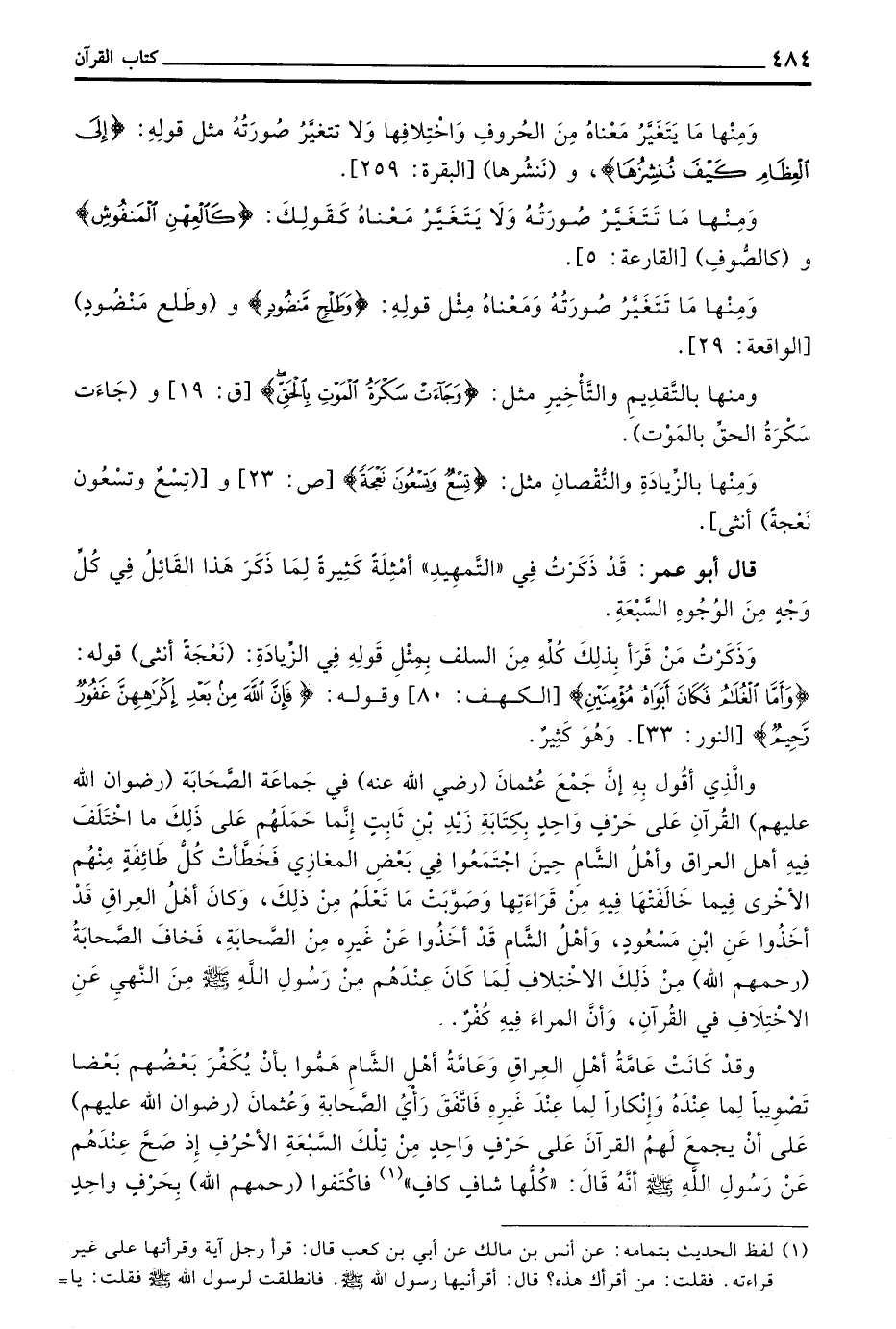 قَالَ أَبُو عُمَرَ قَدْ ذَكَرْتُ فِي التَّمْهِيدِ أَمْثِلَةً كَثِيرَةً لِمَا ذَكَرَ هَذَا الْقَائِلُ فِي كُلِّ وَجْهٍ مِنَ الْوُجُوهِ السَّبْعَةِ