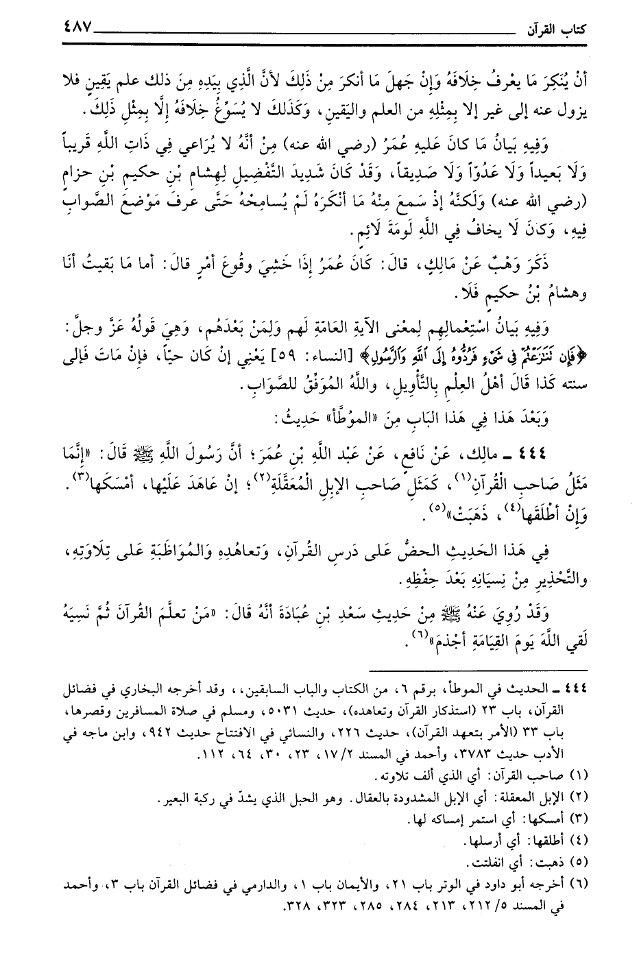 وَبَعْدَ هَذَا فِي هَذَا الْبَابِ مِنَ الْمُوَطَّأِ حَدِيثُ 444 مَالِكٌ عَنْ نَافِعٍ عَنْ عَبْدِ اللَّهِ بْنِ عُمَرَ أَنَّ رَسُولَ اللَّهِ صَلَّى اللَّهُ عَلَيْهِ وَسَلَّمَ قَالَ إِنَّمَا مَثَلُ صَاحِبِ الْقُرْآنِ كَمَثَلِ صَاحِبِ الْإِبِلِ الْمُعَقَّلَةِ إِنْ عَاهَدَ عَلَيْهَا أَمْسَكَهَا وَإِنْ أَطْلَقَهَا ذَهَبَتْ