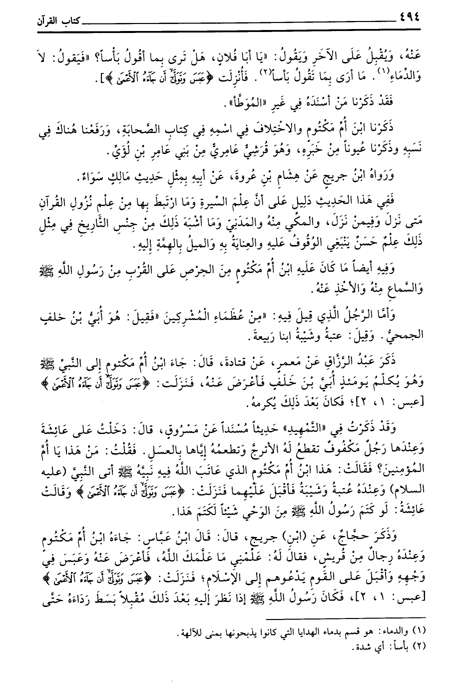 وَقَدْ ذَكَرْتُ فِي التَّمْهِيدِ حَدِيثًا مُسْنَدًا عَنْ مَسْرُوقٍ قَالَ دَخَلْتُ عَلَى عَائِشَةَ وَعِنْدَهَا رَجُلٌ مَكْفُوفٌ تَقْطَعُ لَهُ الْأُتْرُجَّ وَتُطْعِمُهُ إِيَّاهَا بِالْعَسَلِ فَقُلْتُ مَنْ هذا يا أم المؤمنين فقالت هذا بن أُمِّ مَكْتُومٍ الَّذِي عَاتَبَ اللَّهُ فِيهِ نَبِيَّهُ صلى الله عليه وسلم أَتَى النَّبِيَّ (عَلَيْهِ السَّلَامُ) وَعِنْدَهُ عُتْبَةُ وَشَيْبَةُ فَأَقْبَلَ عَلَيْهِمَا فَنَزَلَتْ (عَبَسَ وَتَوَلَّى أَنْ جَاءَهُ الْأَعْمَى) وَقَالَتْ عَائِشَةُ لَوْ كَتَمَ رَسُولُ اللَّهِ صَلَّى اللَّهُ عَلَيْهِ وَسَلَّمَ مِنَ الْوَحْيِ شَيْئًا لكتم هذا