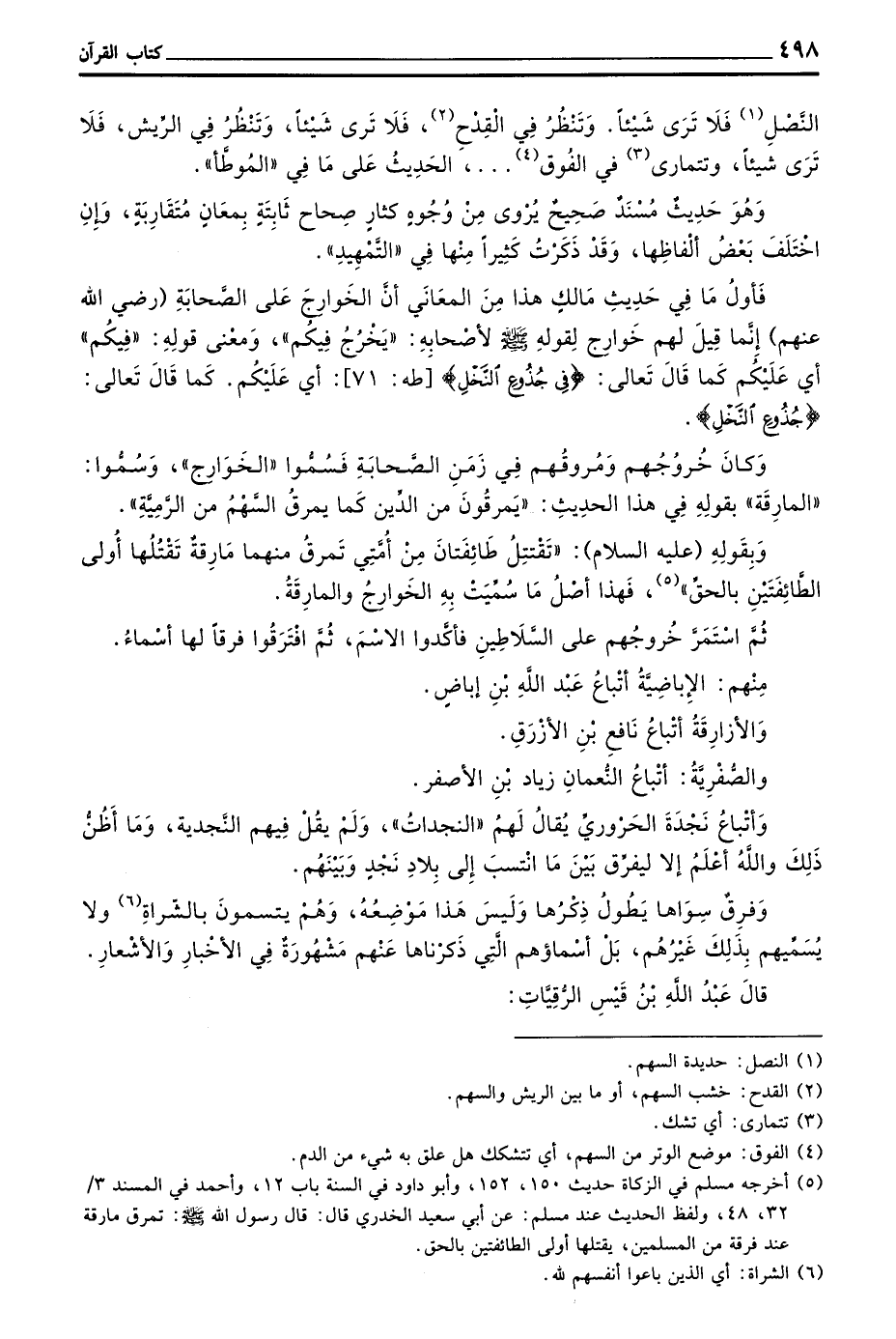 وَبِقَوْلِهِ (عَلَيْهِ السَّلَامُ) تَقْتَتِلُ طَائِفَتَانِ مِنْ أُمَّتِي تَمْرُقُ مِنْهُمَا مَارِقَةٌ تَقْتُلُهَا أَوْلَى الطَّائِفَتَيْنِ بِالْحَقِّ فَهَذَا أَصِلُ مَا سُمِّيَتْ بِهِ الْخَوَارِجُ وَالْمَارِقَةُ