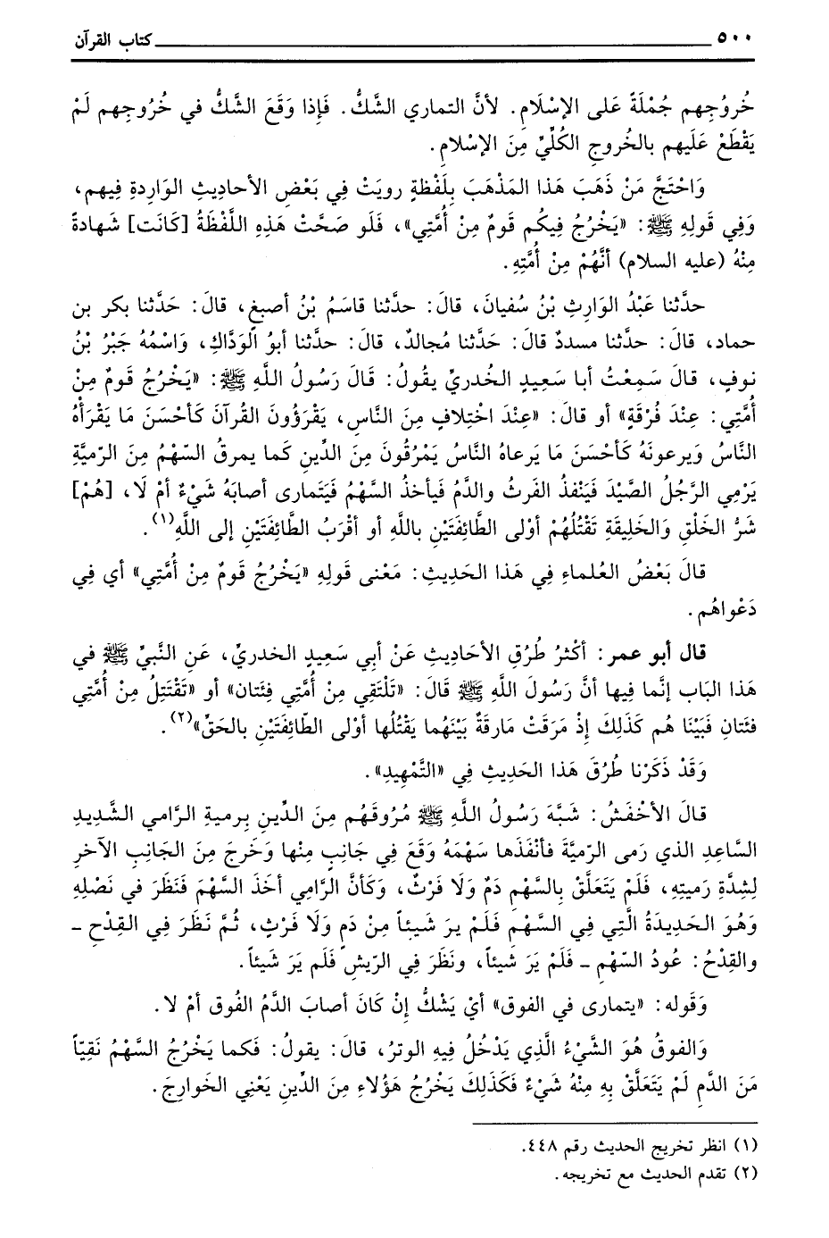 حَدَّثَنَا عَبْدُ الْوَارِثِ بْنُ سُفْيَانَ قَالَ حَدَّثَنَا قَاسِمُ بْنُ أَصْبَغَ قَالَ حَدَّثَنَا بَكْرُ بْنُ حَمَّادٍ قَالَ حَدَّثَنَا مُسَدَّدٌ قَالَ حَدَّثَنَا مُجَالِدٌ قَالَ حَدَّثَنَا أَبُو الْوَدَّاكِ وَاسْمُهُ جَبْرُ بْنُ نُوفٍ قَالَ سَمِعْتُ أَبَا سَعِيدٍ الْخُدْرِيَّ يَقُولُ قَالَ رَسُولُ اللَّهِ صَلَّى اللَّهُ عَلَيْهِ وَسَلَّمَ يَخْرُجُ قَوْمٌ مِنْ أُمَّتِي عِنْدَ فِرْقَةٍ أَوْ قَالَ عِنْدَ اختلاف من الناس يقرؤون الْقُرْآنَ كَأَحْسَنِ مَا يَقْرَأَهُ النَّاسُ وَيَرْعَوْنَهُ كَأَحْسَنِ مَا يَرْعَاهُ النَّاسُ يَمْرُقُونَ مِنَ الدِّينِ كَمَا يَمْرُقُ السَّهْمُ مِنَ الرَّمِيَّةِ يَرْمِي الرَّجُلُ الصَّيْدَ فَيُنْفِذُ الْفَرْثَ وَالدَّمَ فَيَأْخُذُ السَّهْمَ فَيَتَمَارَى أَصَابَهُ شَيْءٌ أَمْ لَا هُمْ شَرُّ الْخَلْقِ وَالْخَلِيقَةِ تَقْتُلُهُمْ أَوْلَى الطَّائِفَتَيْنِ بِاللَّهِ أَوْ أَقْرَبُ الطَّائِفَتَيْنِ إِلَى اللَّهِ