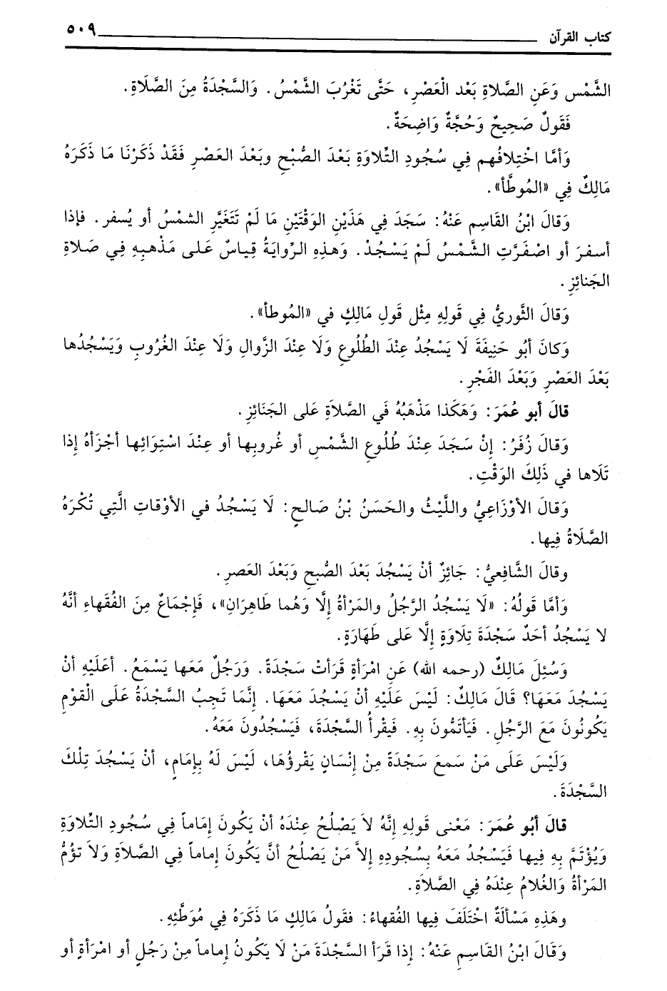 وَكَانَ أَبُو حَنِيفَةَ لَا يَسْجُدُ عِنْدَ الطُّلُوعِ وَلَا عِنْدَ الزَّوَالِ وَلَا عِنْدَ الْغُرُوبِ وَيَسْجُدُهَا بَعْدَ الْعَصْرِ وَبَعْدَ الْفَجْرِ