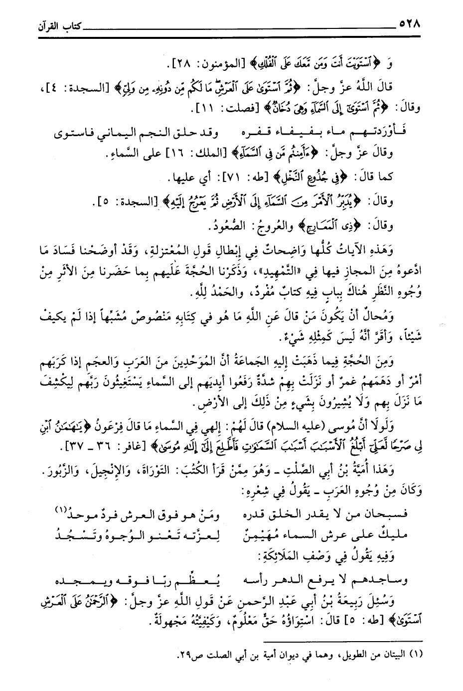 (وَسَاجِدُهُمْ لَا يَرْفَعُ الدَّهْرُ رَأْسَهُ ... يُعَظِّمُ رَبًّا فَوْقَهُ وَيُمَجِّدُهُ) وَسُئِلَ رَبِيعَةُ بْنُ أَبِي عَبْدِ الرَّحْمَنِ عَنْ قَوْلِ اللَّهِ عَزَّ وَجَلَّ (الرَّحْمَنُ عَلَى العرش استوى) طه 5 قال استواؤهم حَقٌّ مَعْلُومٌ وَكَيْفِيَّتُهُ مَجْهُولَةٌ