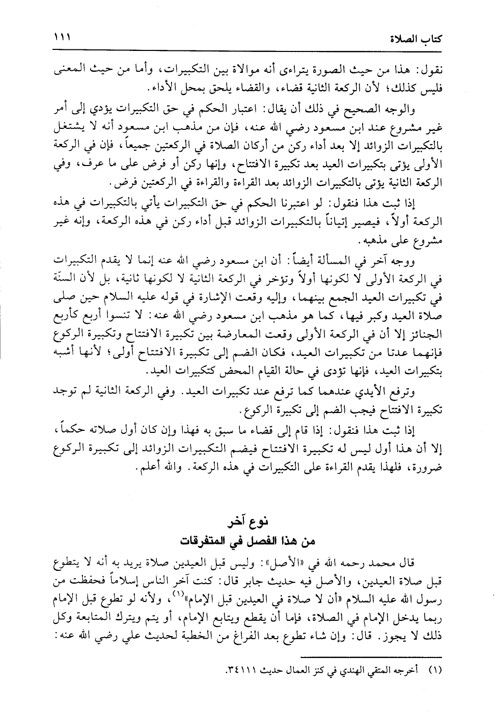 ووجه آخر في المسألة أيضاً: أن ابن مسعود رضي الله عنه إنما لا يقدم التكبيرات في الركعة الأولى لا لكونها أولاً وتؤخر في الركعة الثانية لا لكونها ثانية، بل لأن السنّة في تكبيرات العيد الجمع بينهما، وإليه وقعت الإشارة في قوله عليه السلام حين صلى صلاة العيد وكبر فيها، كما هو مذهب ابن مسعود رضي الله عنه: لا تنسوا أربع كأربع الجنائز إلا أن في الركعة الأولى وقعت المعارضة بين تكبيرة الافتتاح وتكبيرة الركوع فإنهما عدتا من تكبيرات العيد، فكان الضم إلى تكبيرة الافتتاح أولى؛ لأنها أشبه بتكبيرات العيد، فإنها تؤدى في حالة القيام المحض كتكبيرات العيد.