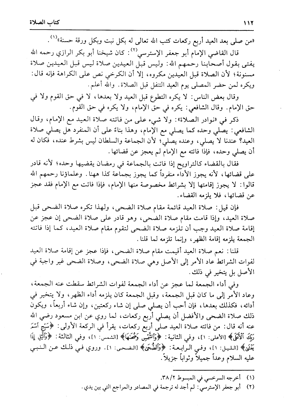 قال القاضي الإمام أبو جعفر الإسترسي: كان شيخنا أبو بكر الرازي رحمه الله يفتى بقول أصحابنا رحمهم الله: وليس قبل العيدين صلاة ليس قبل العيدين صلاة مسنونة؛ لأن الصلاة قبل العيدين مكروه، إلا أن الكرخي نص على الكراهة فإنه قال: ويكره لمن حضر المصلى يوم العيد التنفل قبل الصلاة. والله أعلم.