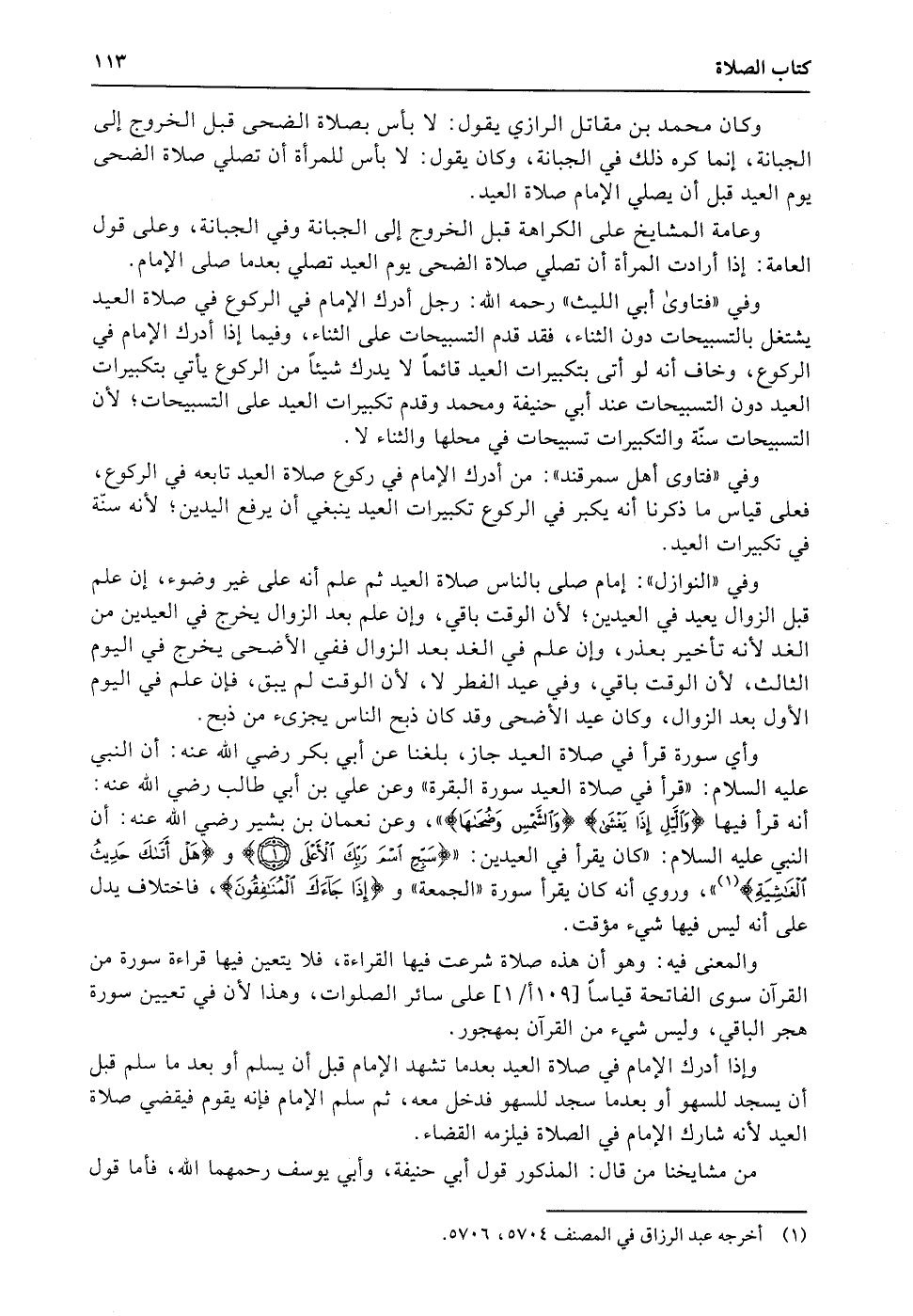 وكان محمد بن مقاتل الرازي يقول: لا بأس بصلاة الضحى قبل الخروج إلى الجبانة، إنما كره ذلك في الجبانة، وكان يقول: لا بأس للمرأة أن تصلي صلاة الضحى يوم العيد قبل أن يصلي الإمام صلاة العيد.