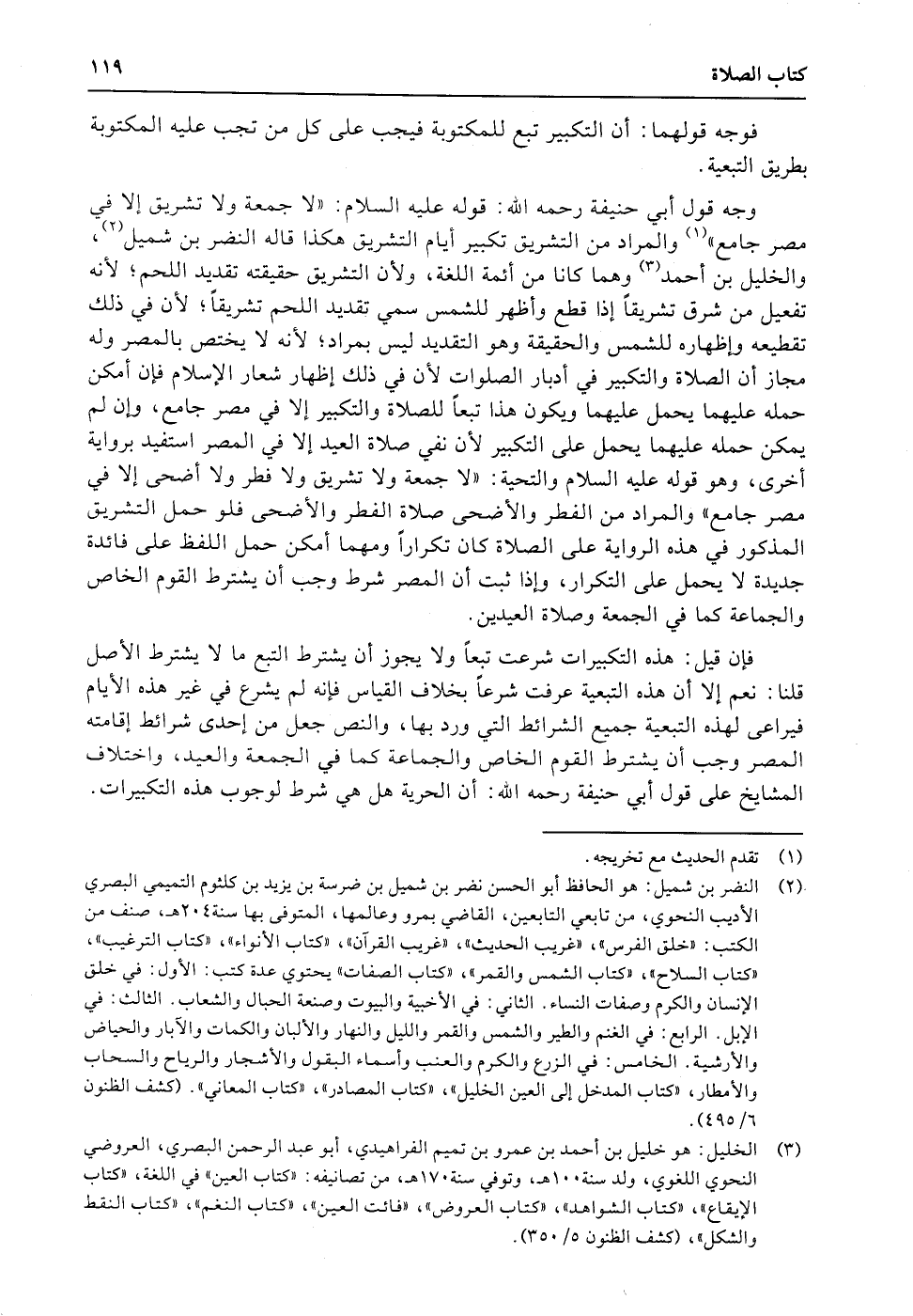 فإن قيل: هذه التكبيرات شرعت تبعاً ولا يجوز أن يشترط التبع ما لا يشترط الأصل قلنا: نعم إلا أن هذه التبعية عرفت شرعاً بخلاف القياس فإنه لم يشرع في غير هذه الأيام فيراعى لهذه التبعية جميع الشرائط التي ورد بها، والنص جعل من إحدى شرائط إقامته المصر وجب أن يشترط القوم الخاص والجماعة كما في الجمعة والعيد، واختلاف المشايخ على قول أبي حنيفة رحمه الله: أن الحرية هل هي شرط لوجوب هذه التكبيرات.