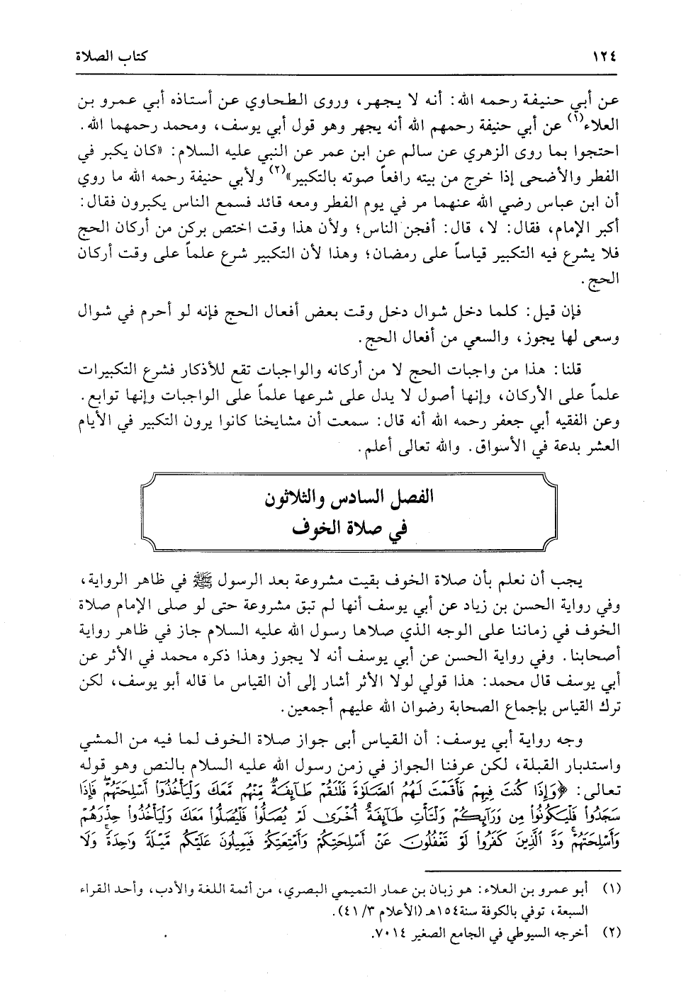 يجب أن نعلم بأن صلاة الخوف بقيت مشروعة بعد الرسول صلى الله عليه وسلّمفي ظاهر الرواية، وفي رواية الحسن بن زياد عن أبي يوسف أنها لم تبق مشروعة حتى لو صلى الإمام صلاة الخوف في زماننا على الوجه الذي صلاها رسول الله عليه السلام جاز في ظاهر رواية أصحابنا. وفي رواية الحسن عن أبي يوسف أنه لا يجوز وهذا ذكره محمد في الأثر عن أبي يوسف قال محمد: هذا قولي لولا الأثر أشار إلى أن القياس ما قاله أبو يوسف، لكن ترك القياس بإجماع الصحابة رضوان الله عليهم أجمعين.