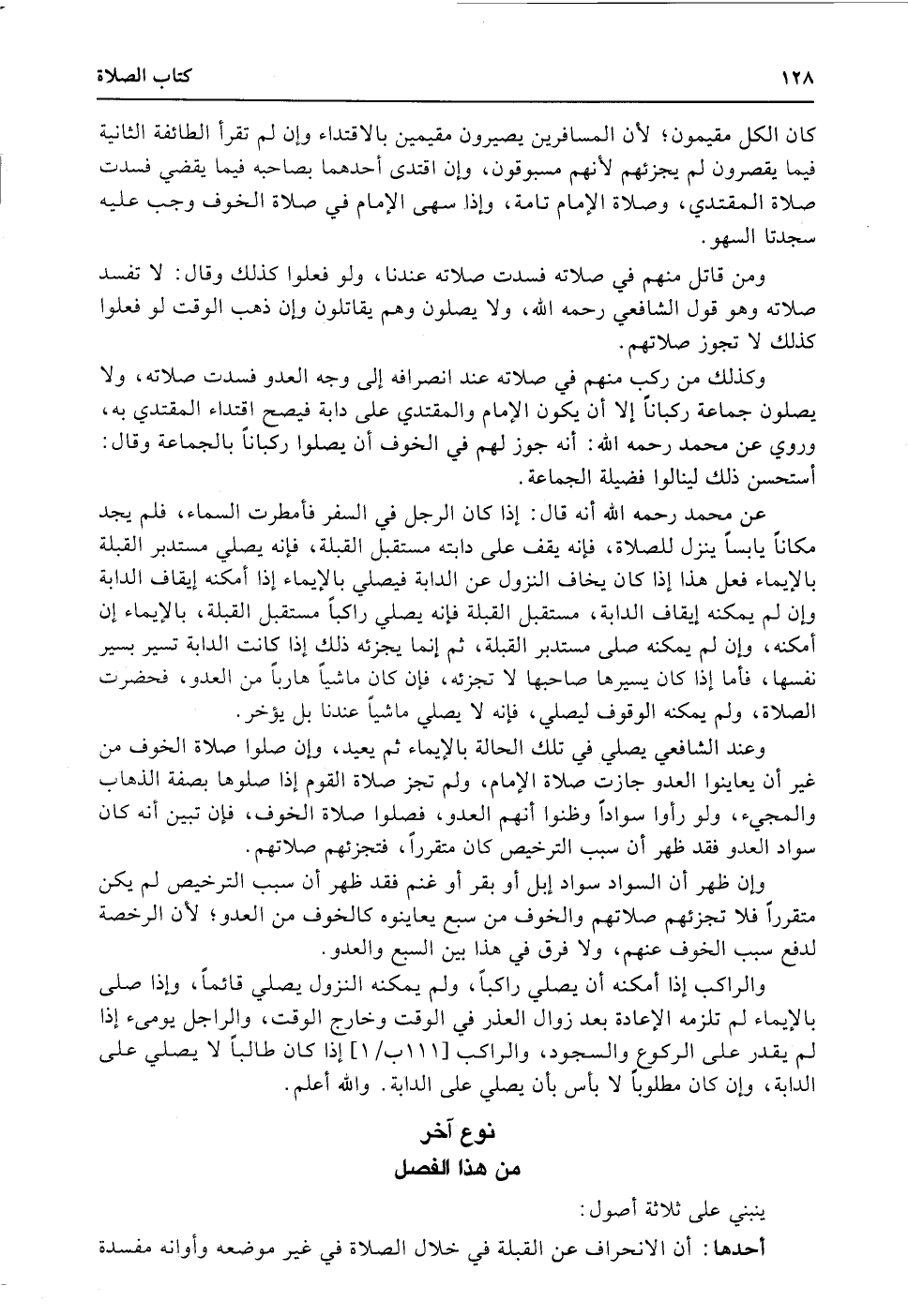 وكذلك من ركب منهم في صلاته عند انصرافه إلى وجه العدو فسدت صلاته، ولا يصلون جماعة ركباناً إلا أن يكون الإمام والمقتدي على دابة فيصح اقتداء المقتدي به، وروي عن محمد رحمه الله: أنه جوز لهم في الخوف أن يصلوا ركباناً بالجماعة وقال: أستحسن ذلك لينالوا فضيلة الجماعة.